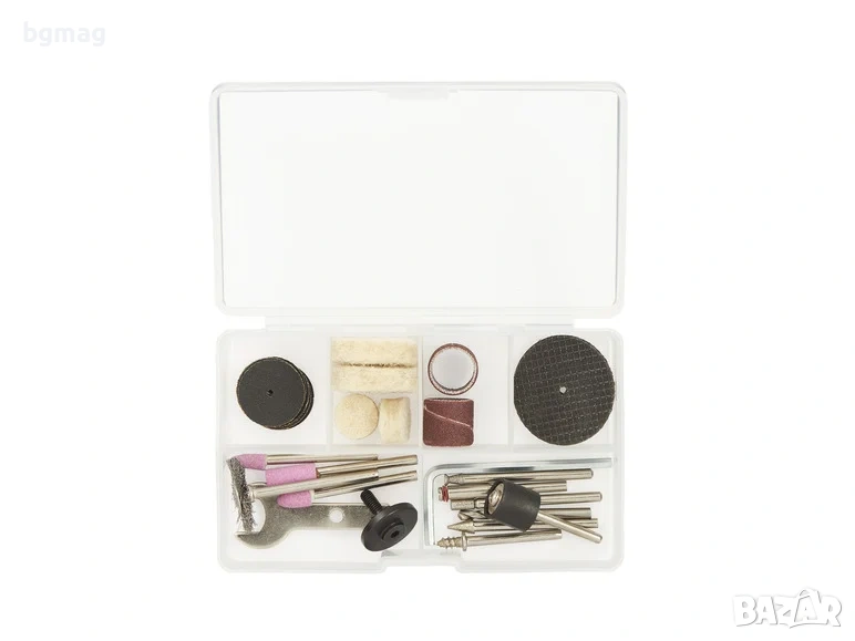 Включени аксесоари: 1x режещ диск за метал (Ø 50 mm с 10 mm отвор - предварително сглобен), 1x адаптер за режещи и шлифовъчни дискове с 10 mm отвор (предварително сглобен) и кутия с комплект аксесоари от 32 части: 10x шлифовъчни листове (Ø 20 mm), 2x режещи дискове (32,2 mm), 1x режещ и шлифовъчен шпиндел, 2x шлифовъчни ленти (Ø 15 mm), включително 1x шпиндел за шлифовъчна лента, 4x филцови дискове за полиране (Ø 25,5 mm / Ø 13 mm), включително 1x шпиндел за полиращи дискове, 3x шлифовъчни щифтове от силициев карбид, 3x диамантени шлифовъчни щифтове, 1x HSS свредло, 1x стоманена четка (Ø 23 mm), 1x адаптер за рязане и шлифовъчни дискове с отвор 6,4 mm (за дискове с Ø 38 mmˡ), 1x гаечен ключ, 1x шестостен