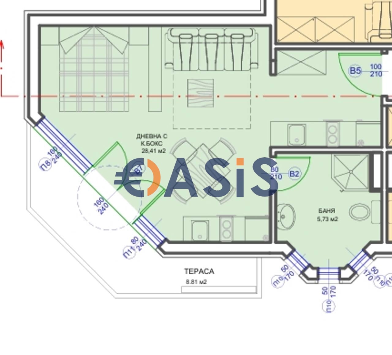 Антре, хол с кухненски бокс , баня с тоалетна, просторна тераса .