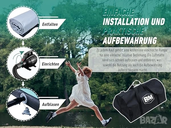 * Бърза настройка: Включената в комплекта електрическа помпа (600W) позволява надуване и изпускане на въздуха за по-малко от 1 минута.