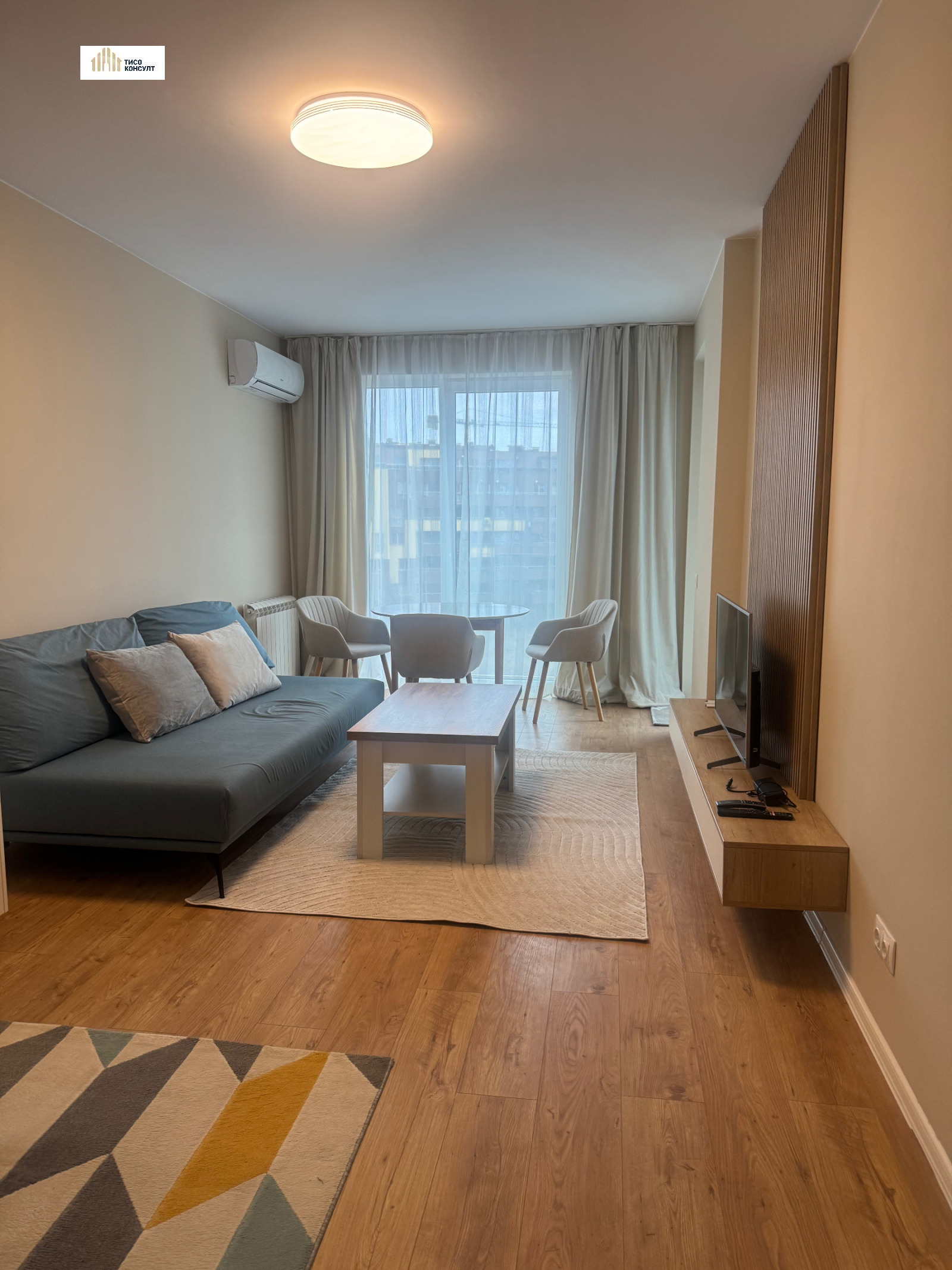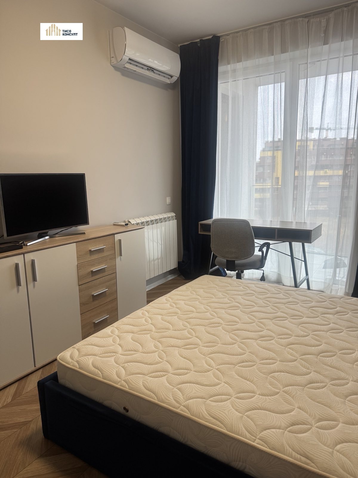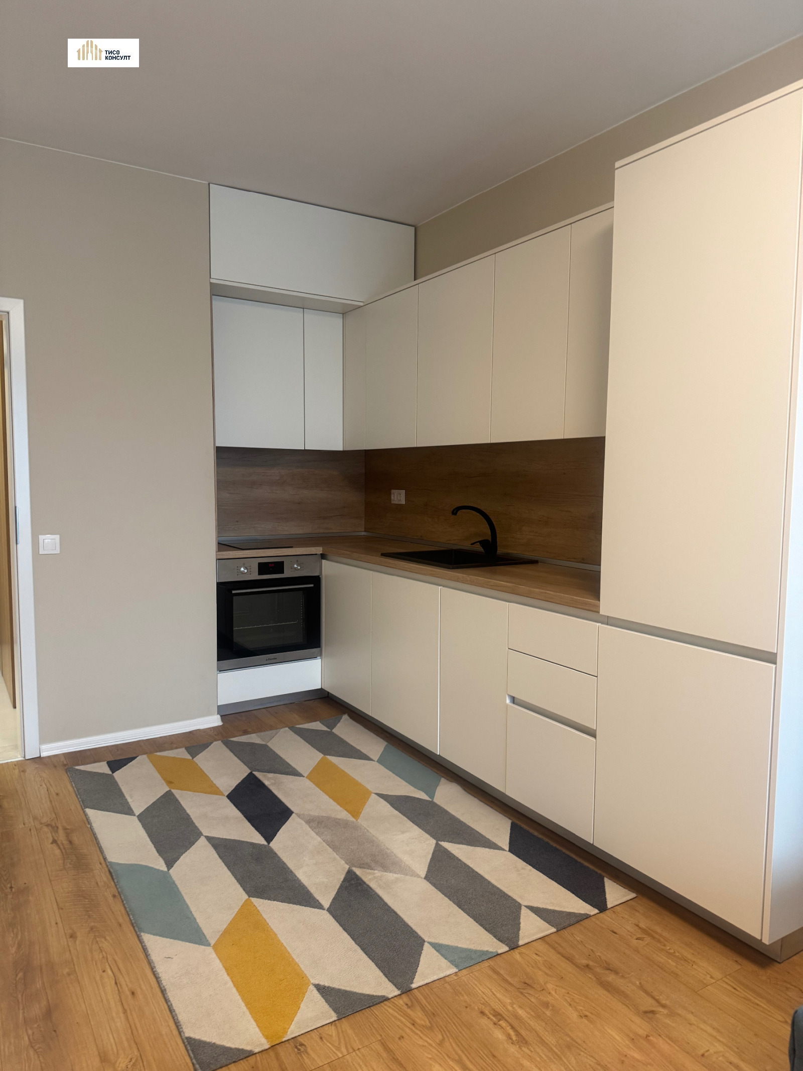 Жилището има следното функционалнон разпределение: входно антре /с пералня/, просторна дневна с изцяло оборудван кухненски бокс с всичко необходимо за едно домакинство /абсорбатор, миялна, индокционни котлони/, балкон, непреходна спалня, баня с тоалетна.