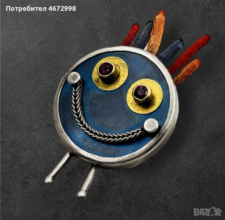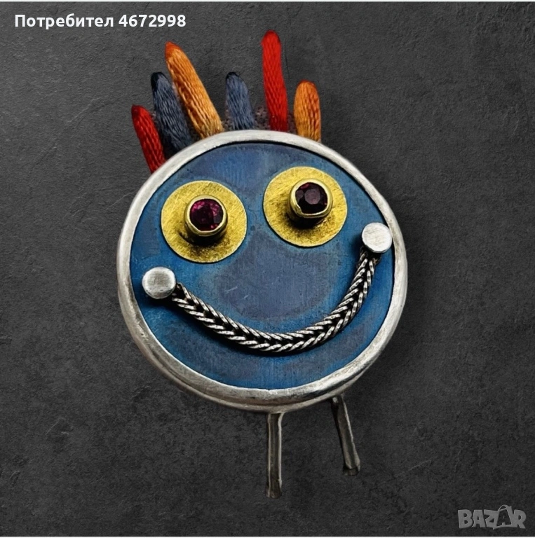Представяме Ви артистична и оригинална брошка, изработена от сребро с елементи от 22 каратово жълто злато. Дизайнът ѝ е забавен и закачлив, оформен като усмихнато личице с цветни акценти.