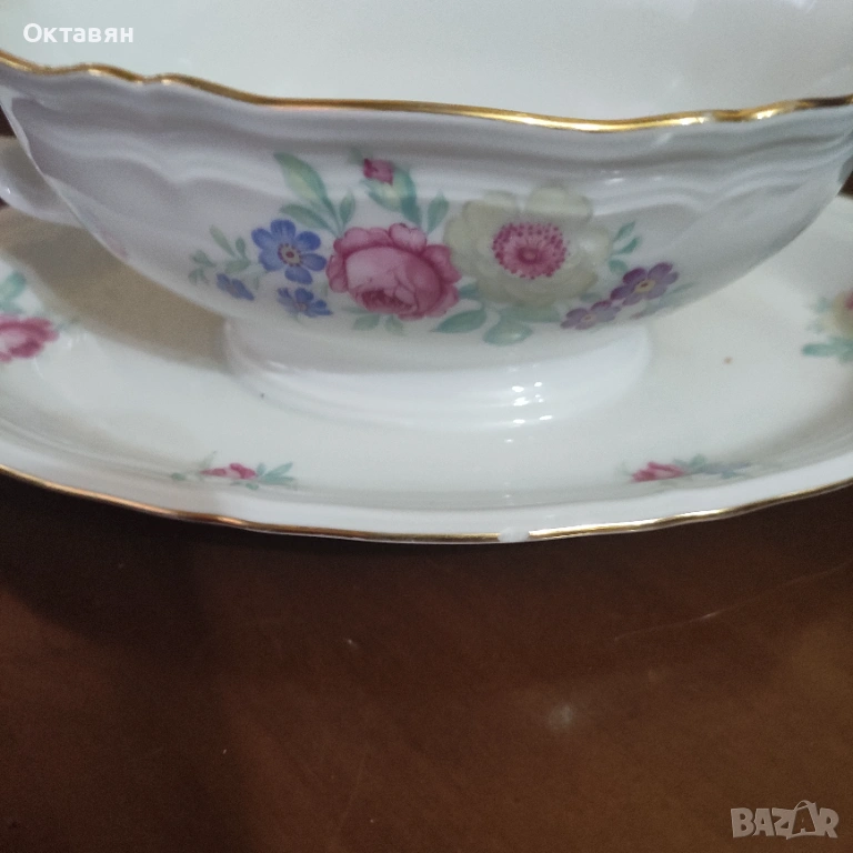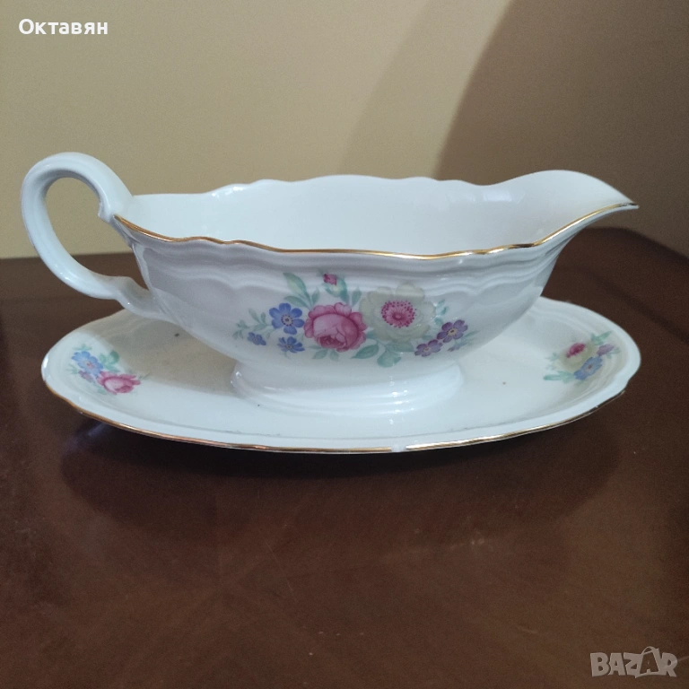 Винтидж порцеланова сосиера с вградена подложка с двустранен декор, маркирана, барок Seltmann - Германия. Има точка на златния кант на подложката, мисля, че е фабрична. Размери-височина - 8 см., дължина-22 см.