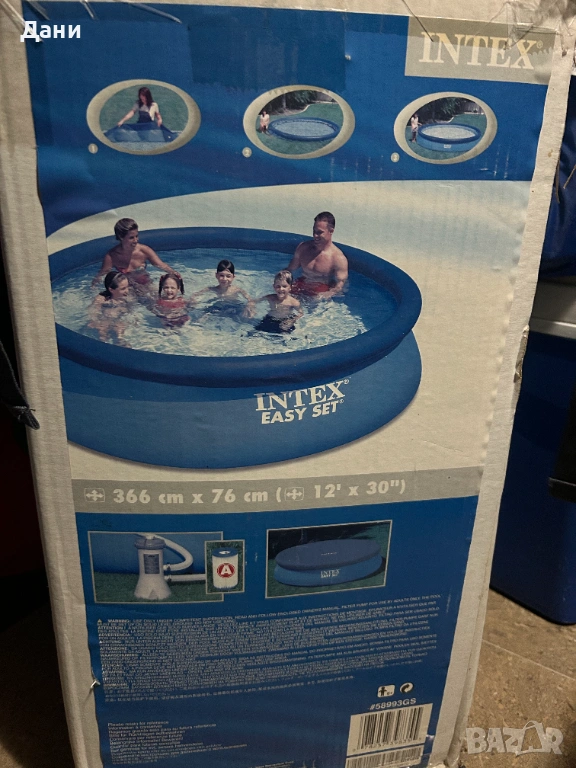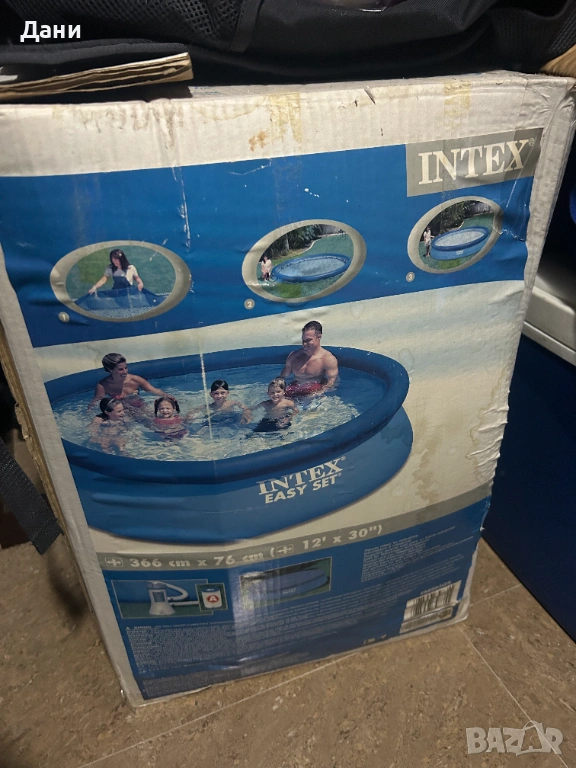 Използван надуваем басейн на Intex, с размери 366 см x 76 см. Подходящ за семейна употреба, с възможност за поставяне на деца и възрастни. Лесен за сглобяване и поддръжка.