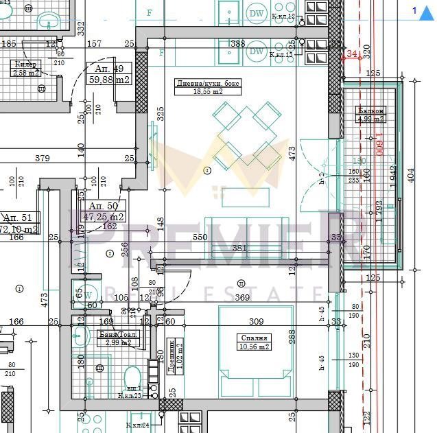 Апартаментът е с качествено разпределение и се състои от удобно входно антре с място за портманто и изводи за монтаж на пералня и бойлер, хубава светла всекидневна с кухненски бокс 18.5 м2 с 'френски' прозорци, приятна спалня 10,5 м2, голям балкон 5 м2 обслужващ дневната, баня с тоалет 3 м2.