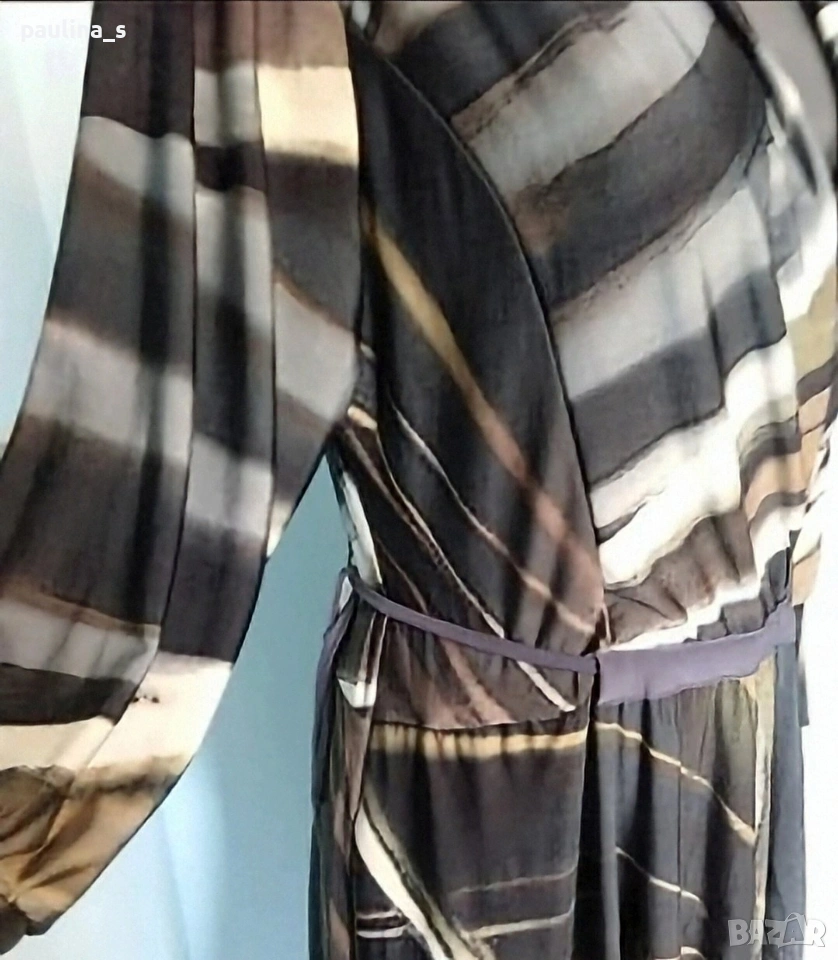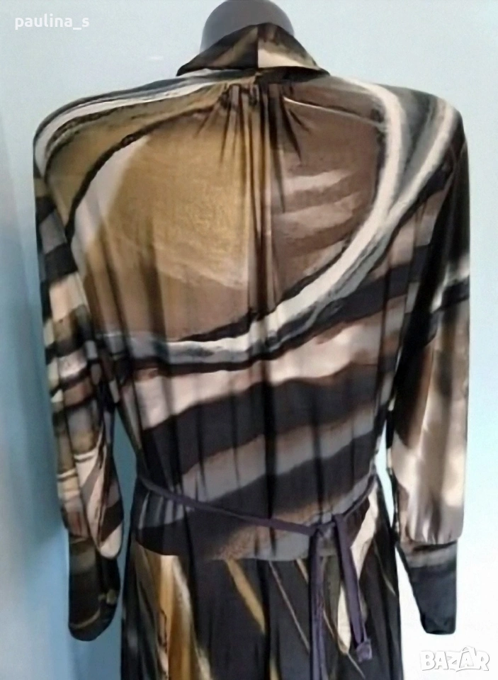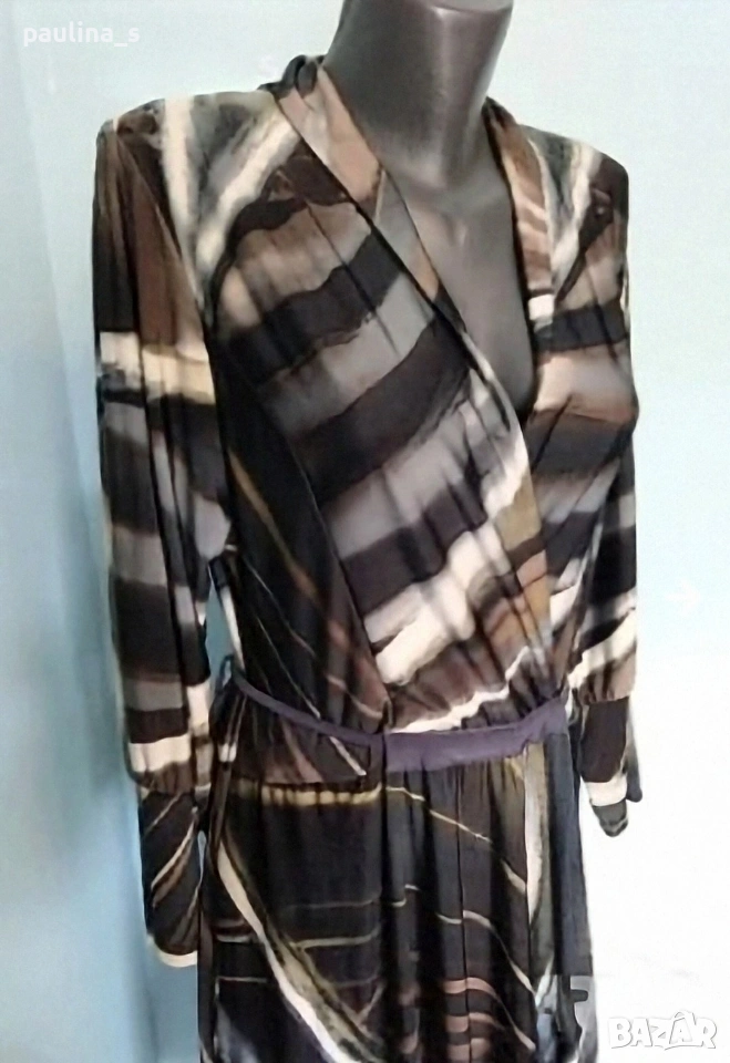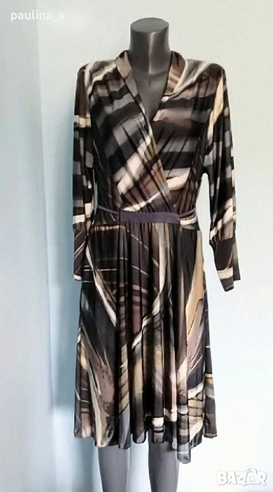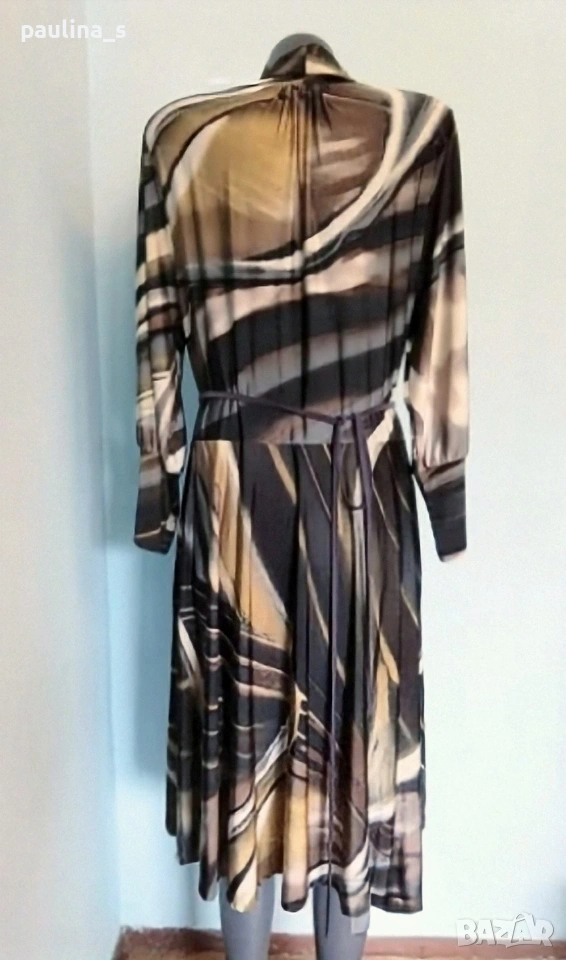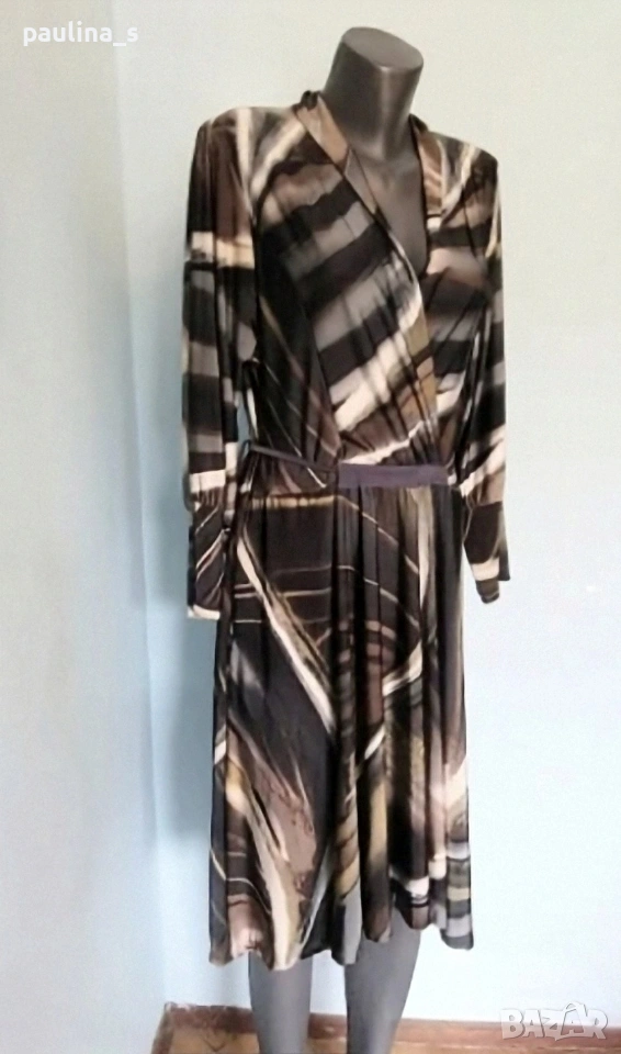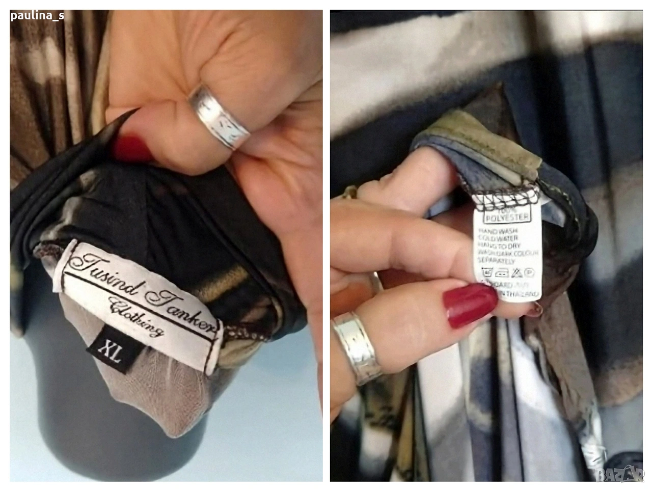 2️⃣. Колаж / XL / 3XL - Зашеметяваща маркова рокля "Tusind Tanker" clothing. Цената е крайна 50 евро. Маркова рокля от еластична ликра с прихлуващо гръцко деколте, разкроена долна част, буфон ръкави и елегантен аутлук. Подходяща е за повод или офис, с джобове в страничните тегли. Поради голямата еластичност, покрива няколко размера до 3XL, вижте мерките в обявата, Моля. Нова е, без дефекти, една бройка.