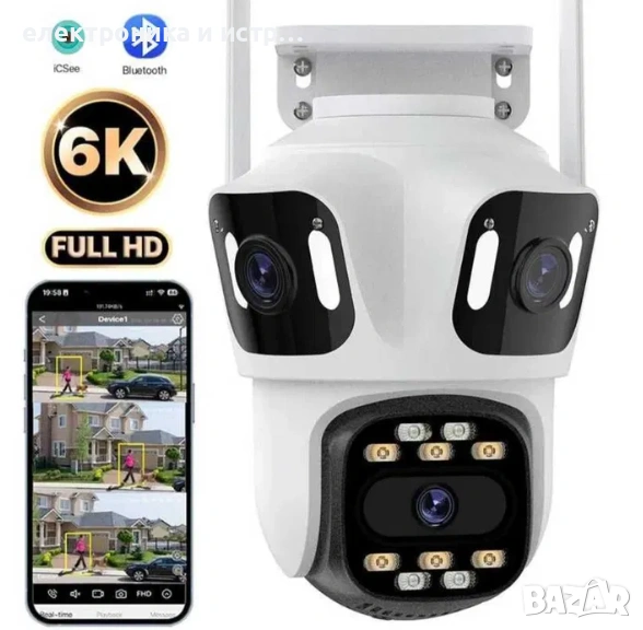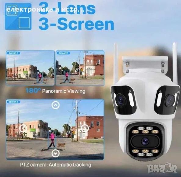 Нов модел иновативна тройна външна WiFi камера с Ultra HD резолюция. Три камери в един корпус: Стационарни и ротационна (въртяща се). 10 Mpx резолюция и за трите обектива. Auto tracking функция за хоризонтално проследяване на движение от ротационната камера. Вграден високочувствителен цифров микрофон за аудио мониторинг и говорител за двупосочна аудио връзка. High Power LED осветители за цветно нощно виждане до 30 метра. Функция за хоризонтално и веетикално проследяване на движението на ротационната камера. Слод за micro SD карта до 128GB. Безплатно мобилно приложение за iPhone и Android - ICSee, XMeye, XMEye Pro за отдалечено наблюдение в реално време и преглед на записите. Завъртане от мобилен телефон по хоризонтала на 270° и по вертикала на 90°. Широкоъгълни обетиви с фокусно разстояние 3.6мм на трите камери, с хоризонтален ъгъл на сцената 90° на стационарните и 120° на въртящата се камера. Функционална стойка даваща възможност за лесен монтаж на таван или стена. Камерата разполага с три нощни режима на работа: Цветен нощен режим, черно-бял нощен режим и цветен нощен режим при движение.
