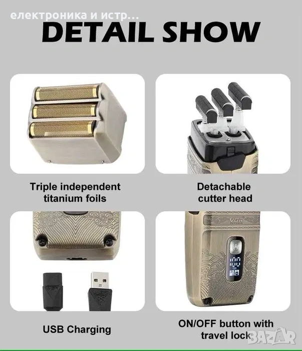 Самобръсначката vgr е предназначена за ежедневна употреба. Ножчетата от неръждаема стомана и титаниевото фолио предлагат бързо и лесно ежедневно бръснене на глава и брада.