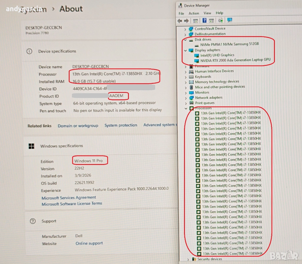 Версията със скъпата видео карта NVIDIA RTX 2000 ADA 8GB GDDR6 в пълната си TGP/TDP от 140W /същата карта в 16 инча лаптоп е с мощност до 100W/ и мощен процесор Intel Core i7 модел 13850HX с 20 физически ядра / 28 нишки, до 5.30GHz, цели 30MB Кеш.