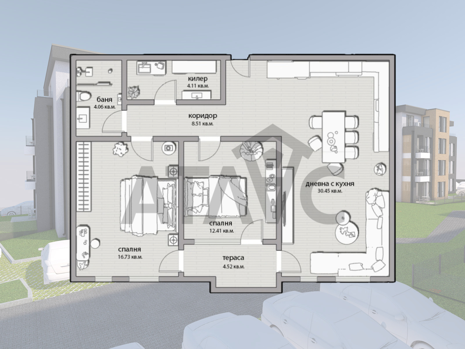 Апартаментът е с добре обмислено разпределение и включва светъл хол с кухненски бокс и трапезария, две просторни спални, баня с тоалетна, практичен килер и тераса, подходящи за релакс. Жилището е проектирано с акцент върху комфорта и качеството на живот. За удобство на бъдещите собственици се предлага възможност за закупуване на паркомясто в комплекса.