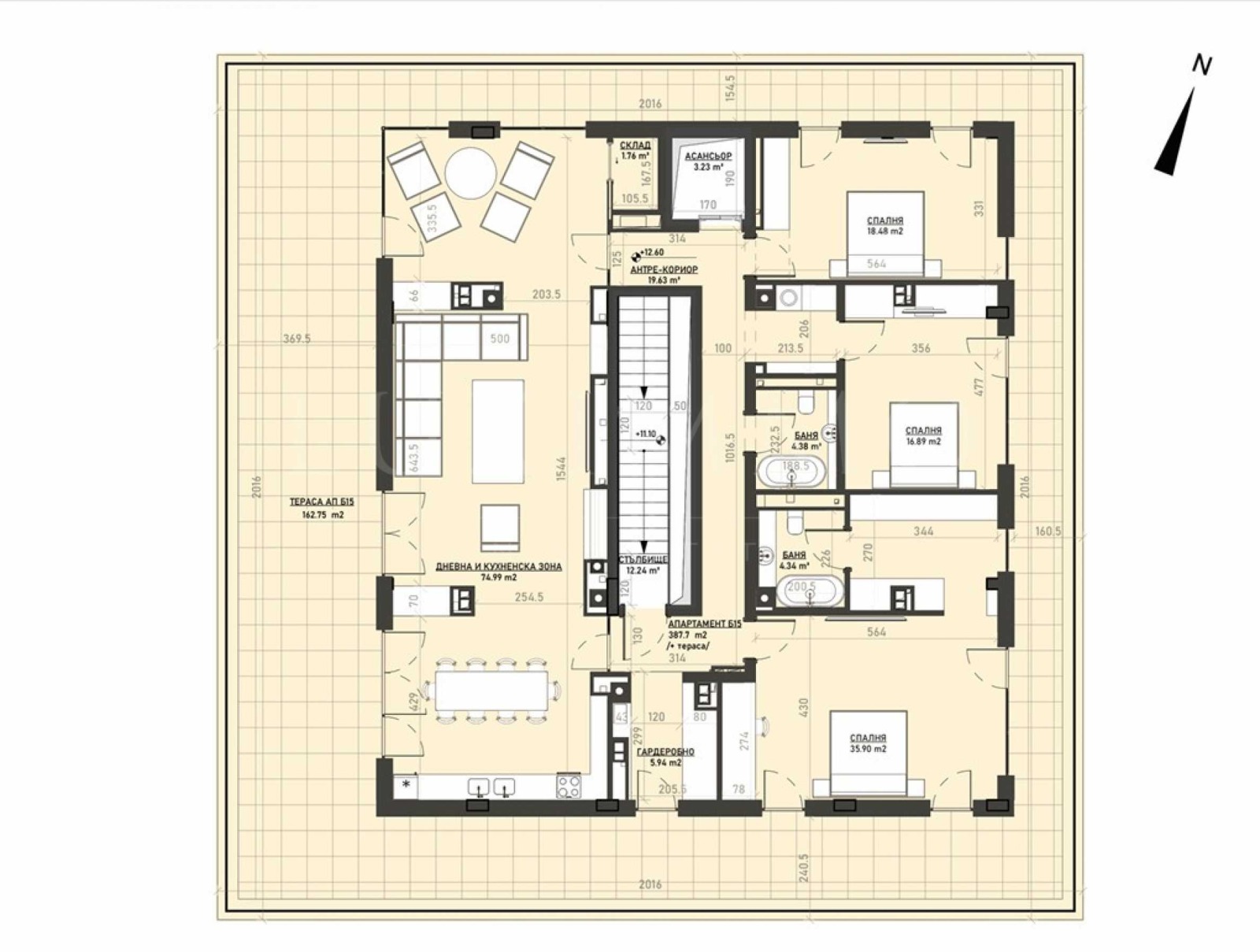 Пентхаусът заема целия последен етаж в сграда Б и има обща площ 432,79 кв.м, чиста площ 387,7 кв.м, тераса, заобикаляща целия имот, с 4 изложения, с площ от 162,75 кв.м.