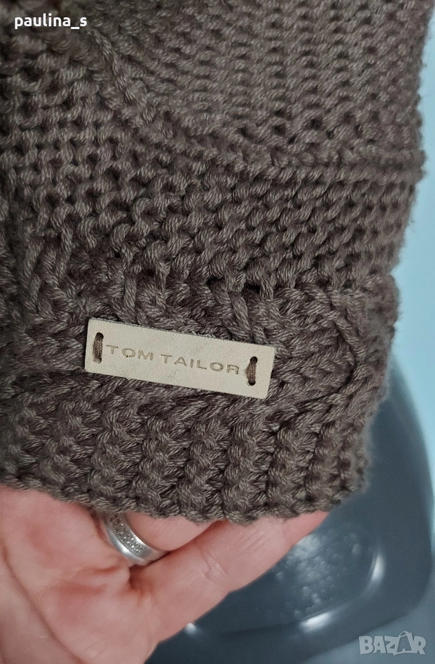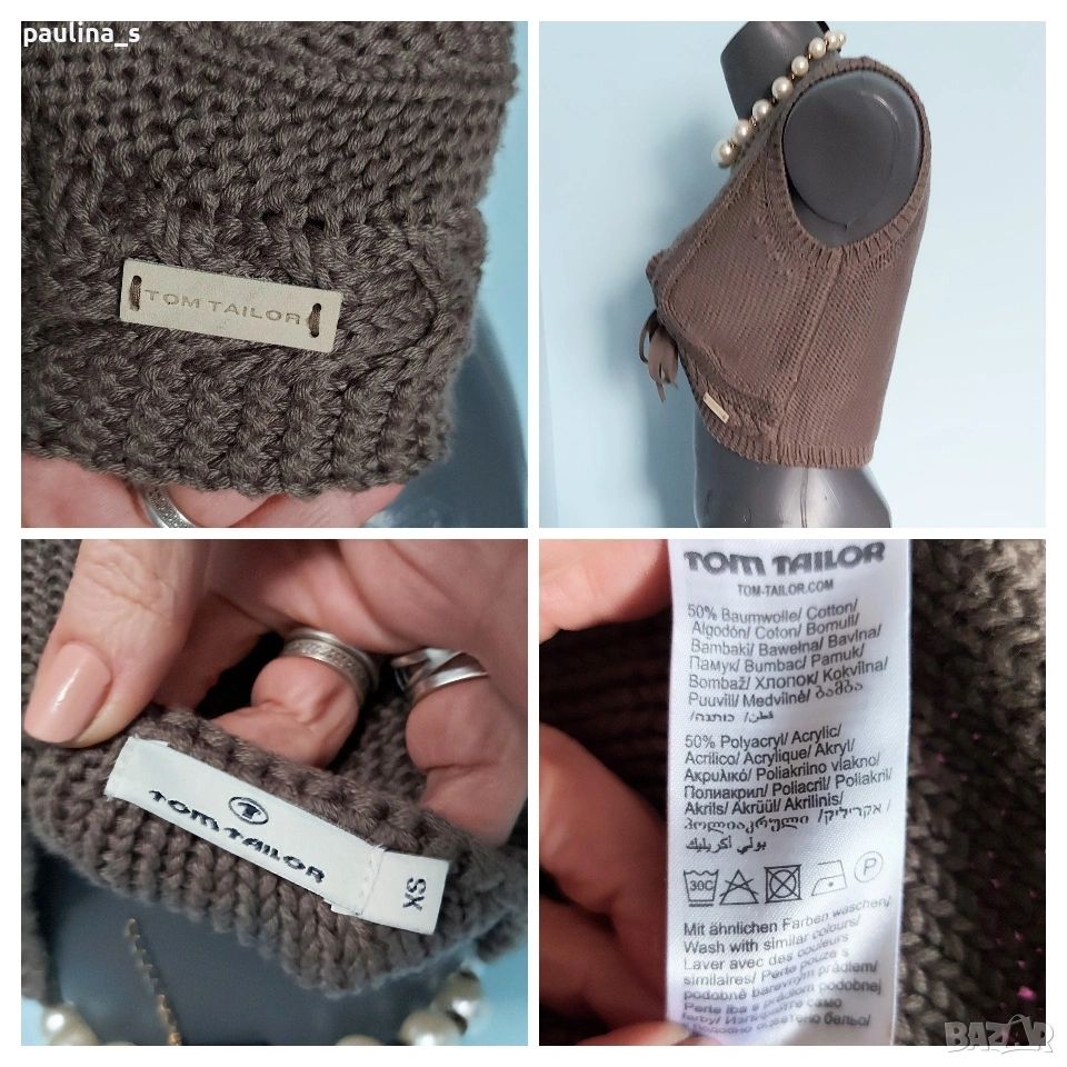 3️⃣ S / M - "Tom Tailor". Цената е крайна, без пазарлъци 17 евро. Дамски брандов топ тип елек от памук и акрил. Плетката е сложна и ефектна, метално лого. Цветът е неутрален - Шам фастък, подхожда на всички други цветови гами, брандиран. Качеството на изработката е гарантирано от бранда! Поради плетената материя може да се носи от от по-голям размер, има еластичност.