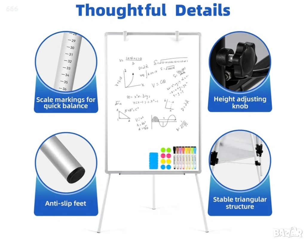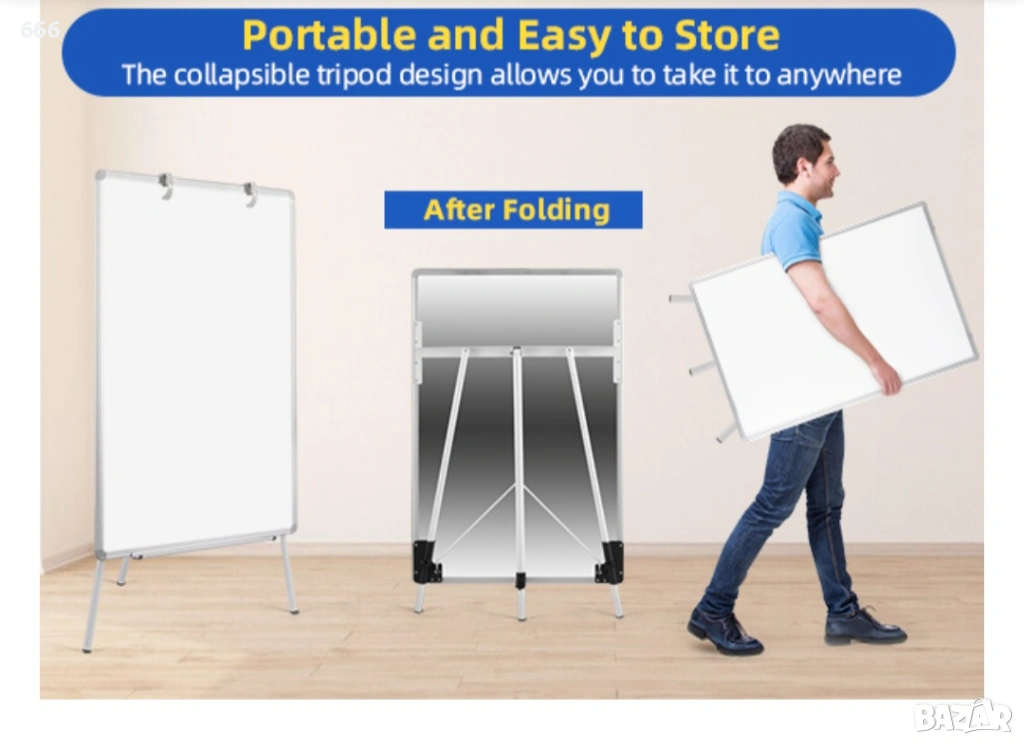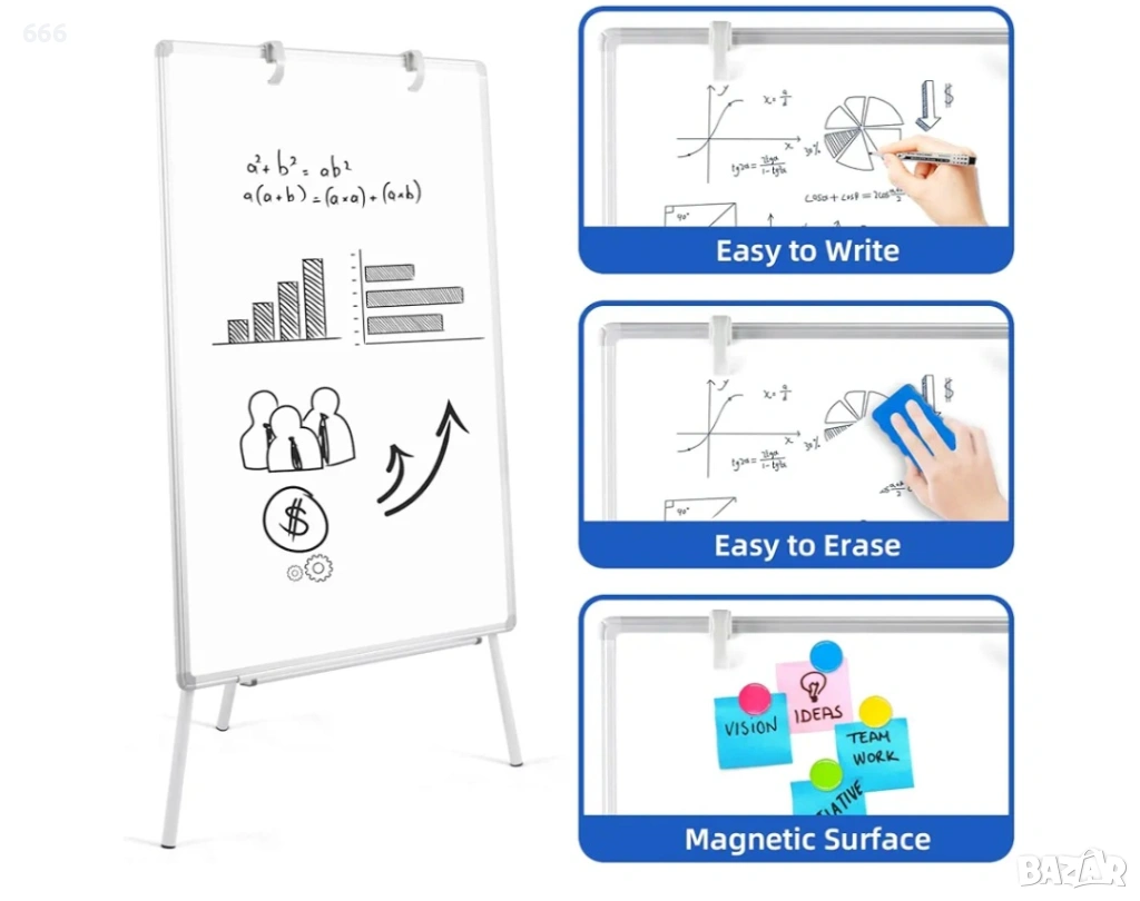 СТОЙКА: Флипчарт дъската е структурно стабилна, а включените гумени крачета са неплъзгащи се, така че стойката за флипчарт няма да се клатушка, независимо дали пишете или изтривате. Ъгълът на наклон на бялата дъска е регулируем, което ви позволява да намерите перфектната позиция за защита на зрението и гръбначния стълб. Сгъваемият статив за флипчарт и алуминиевата рамка също така подобряват лекото тегло на бялата дъска.