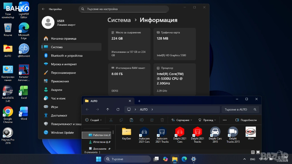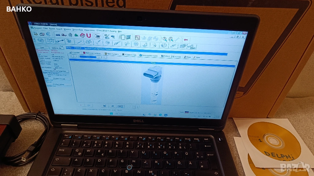 Включва нова универсална автодиагностика за автомобили и камиони и ревизиран лаптоп DEL втора употреба с инсталирани програми на български език.