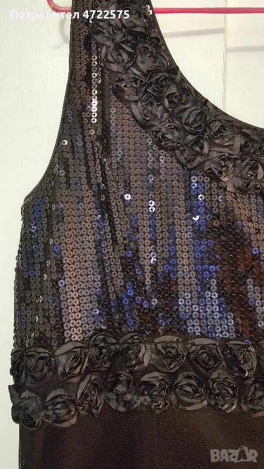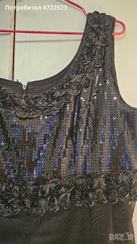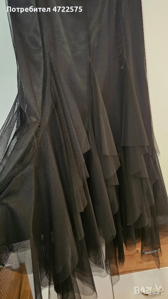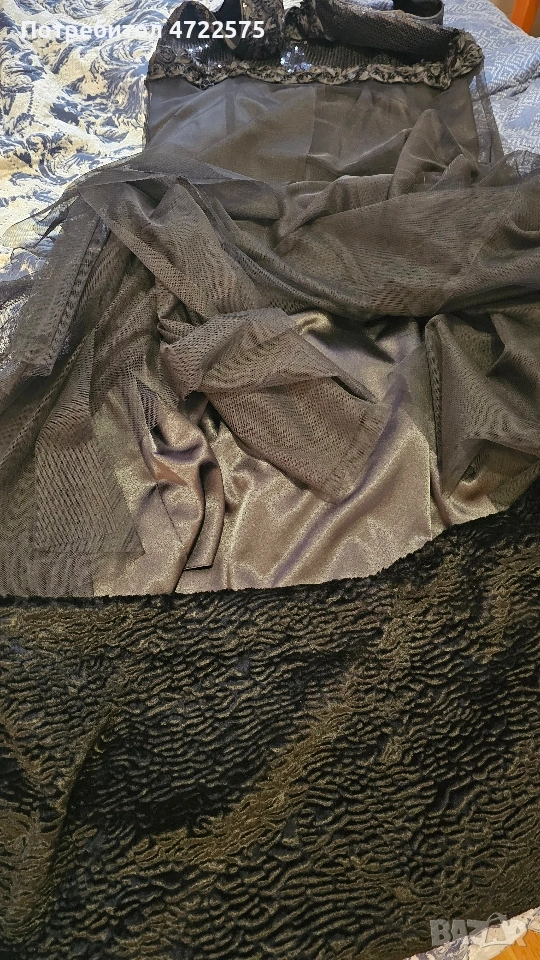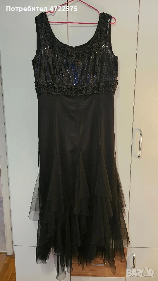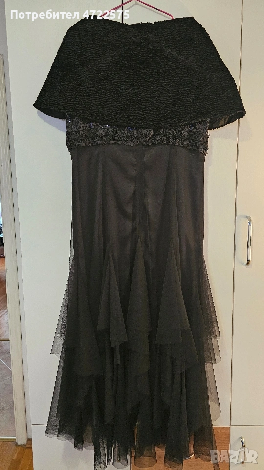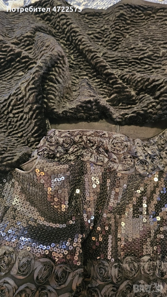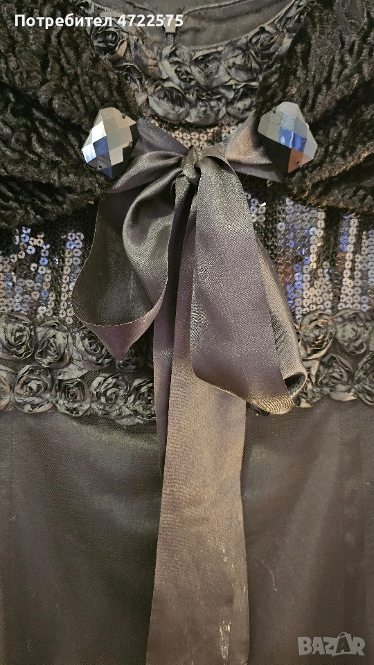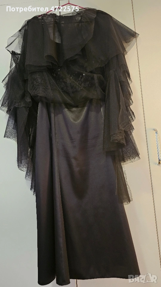 Луксозна дълга черна вечерна рокля с пелерина – размер 44 Предлагам луксозна и изключително елегантна дълга вечерна рокля в класически черен цвят с ефектна пелерина. Моделът е много стилен и изискан – впечатляващ избор за специални и официални поводи. Роклята е с атласен подплатен слой, а горната част на полата е многослойна от фин тюл/гипюр, което придава обем, лекота и модерен силует. Корсетната част е богато украсена с пайети и ръчно оформени рози от плат. Закопчава се със заден цип. Пелерината е от висококачествена материя с текстура тип каракул и се завързва отпред със сатенен бант, който придава допълнителен лукс и завършеност на визията. Роклята е с много високо качество на изработка и материи. Подходяща за бал, официална вечеря, гала събитие, сватба или специален повод. Размер: 44 Цвят: черен Състояние: много добро #луксозна_рокля #вечерна_рокля #черна_рокля #официална_рокля #рокля_за_бал #елегантна_рокля #гала_рокля #лукс #пелерина #дамска_мода #стилен_силует