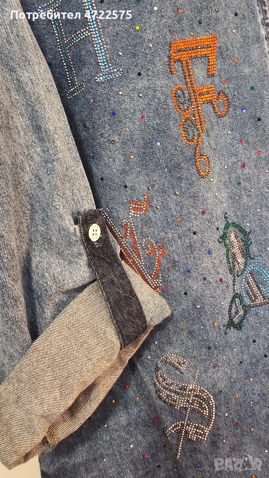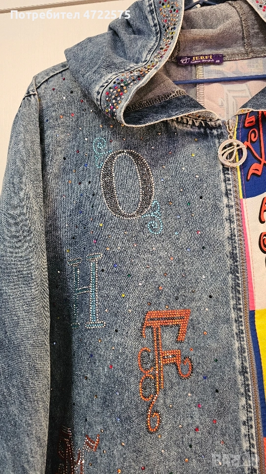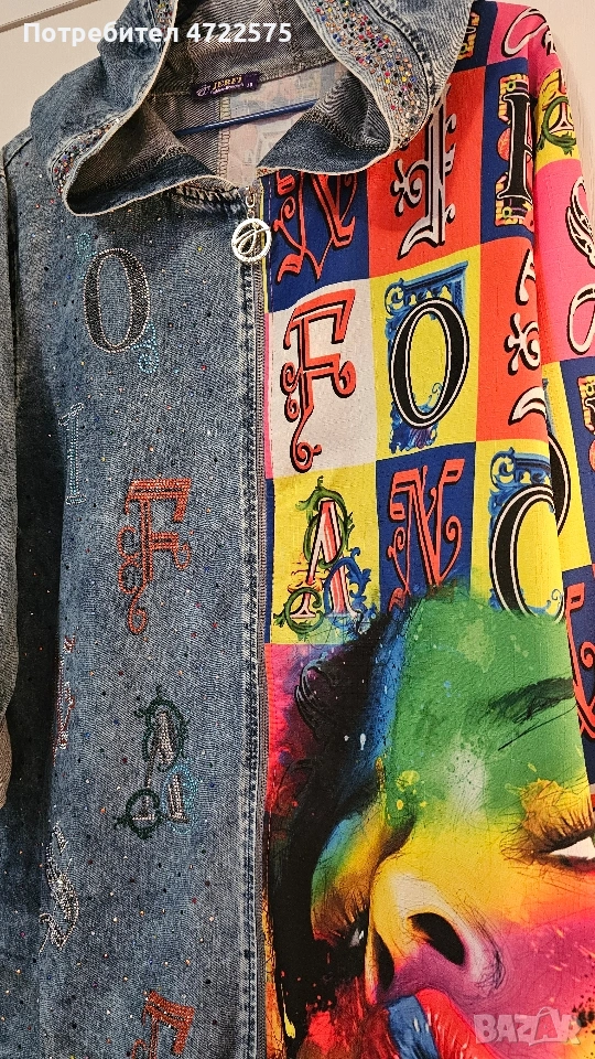 Уникално дизайнерско oversized дънково яке – patchwork streetwear Предлагам изключително стилно и нестандартно oversized дънково яке с уникално дизайнерско изпълнение. Моделът е създаден в patchwork техника и е богато декориран с различни артистични елементи, което го прави истинско модно изявление. Дизайн: Якето е асиметрично и комбинира две напълно различни половини: – Лявата част е от класически син деним с апликации във формата на букви и декоративни камъни (страст и блясък). – Дясната част е изработена от ярък плат с графични букви и голям цветен принт с лице, който привлича погледите и придава артистичен характер. Стил: Streetwear / urban fashion – смело, модерно и екстравагантно. Перфектно за хора, които обичат да се открояват и да изразяват индивидуалността си чрез дрехите си. Комбинира се отлично с дънки, кожен панталон, рокля или спортен аутфит. Идеално за градска визия, фестивали, арт събития и ежедневен моден акцент. Състояние: много добро Кройка: oversized (подходящо за различни размери) Единствено по рода си – няма второ такова!