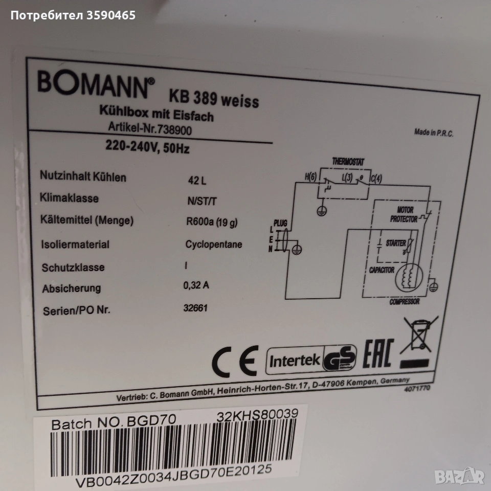 Мини хладилник ,,Bomann" с камера,размери ш-44,Д-46,В-50