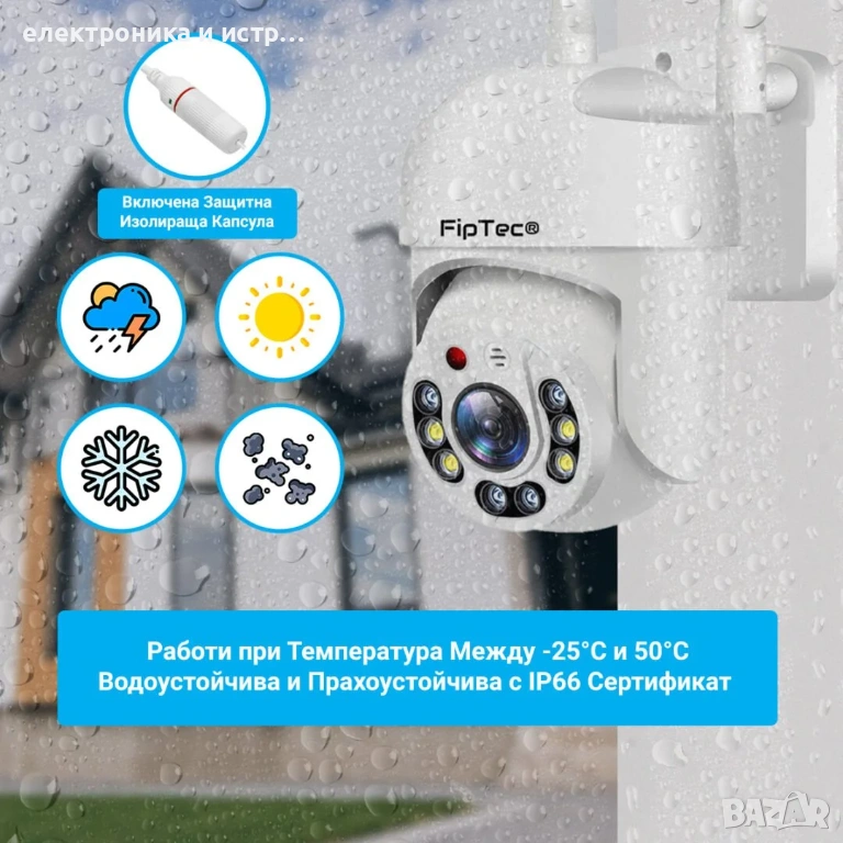 Wifi камерата е водоустойчива Ip66 и е подходяща за външни условия, може да се настрои и монтира за няколко минути, без необходимост от допълнителни устройства.