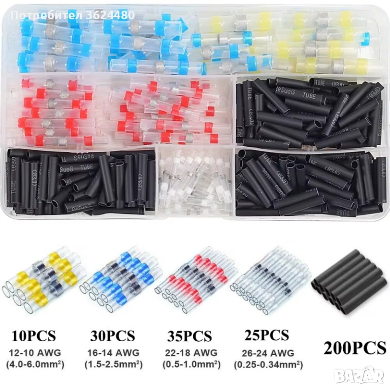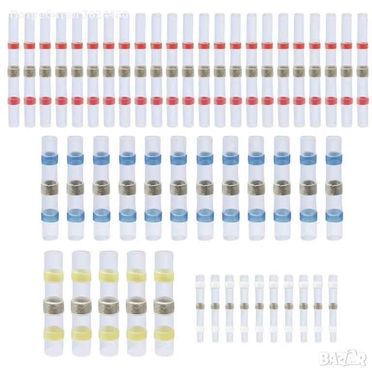 Комплектът включва : общо 100 термосвиваеми конектори с припой, разпределени по цветове за различни сечения: