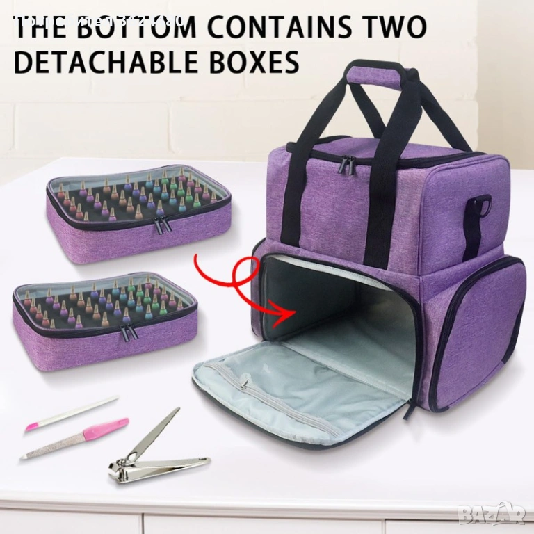 Комплектът включва един двуслоен куфар, две вложки за по 40 лака и удобна презрамка.