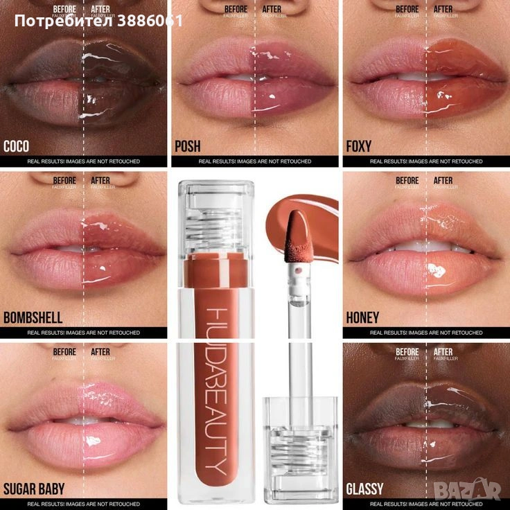 Huda Beauty Faux Filler Shine Balm – BOMBSHELL е гланц-балсам за устни с естествен розово-бежов нюанс и блясък. Съчетава подхранващата грижа на балсам със сочен, плътен ефект, подобен на филър. Формулата осигурява комфорт, хидратация и визуално увеличаване на обема.
