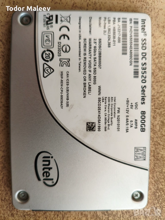 Предлагам за продажба 2 бр. SSD SATA3 диск на Intel. Капацитет 800GB. Дискът е подсилен и може да се използва за монтаж към сторидж и многократно презаписване. Здравето на единия е 93%, а на другия 53%. Посочената цена е за този на 93%. Вторият е на цена от 50 евро.