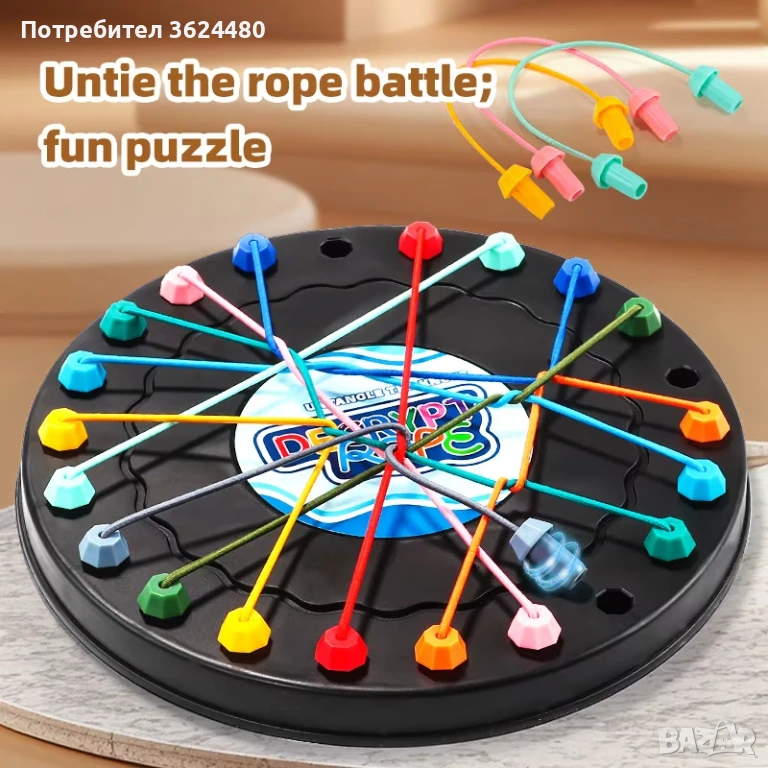 Логическата настолна игра-пъзел с въжета е универсално решение, подходящо както за деца (5+), така и за възрастни.