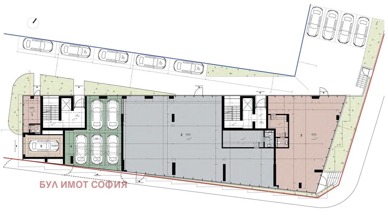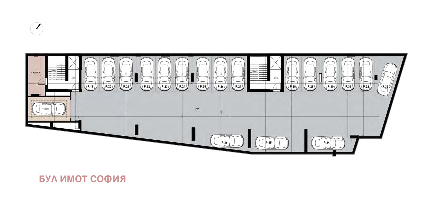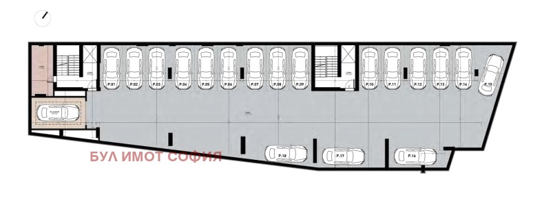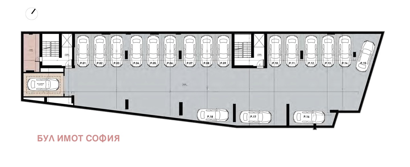 Паркоместа на партера + две подземни нива с достъп чрез подемник.