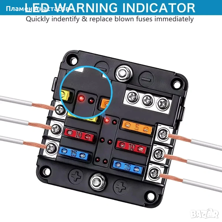 Изработена от висококачествен PBT материал, кутията е устойчива на висока температура, удар и износване. Вградените LED предупредителни индикатори показват при изгорял предпазител, което улеснява бързото откриване и подмяна на проблема.