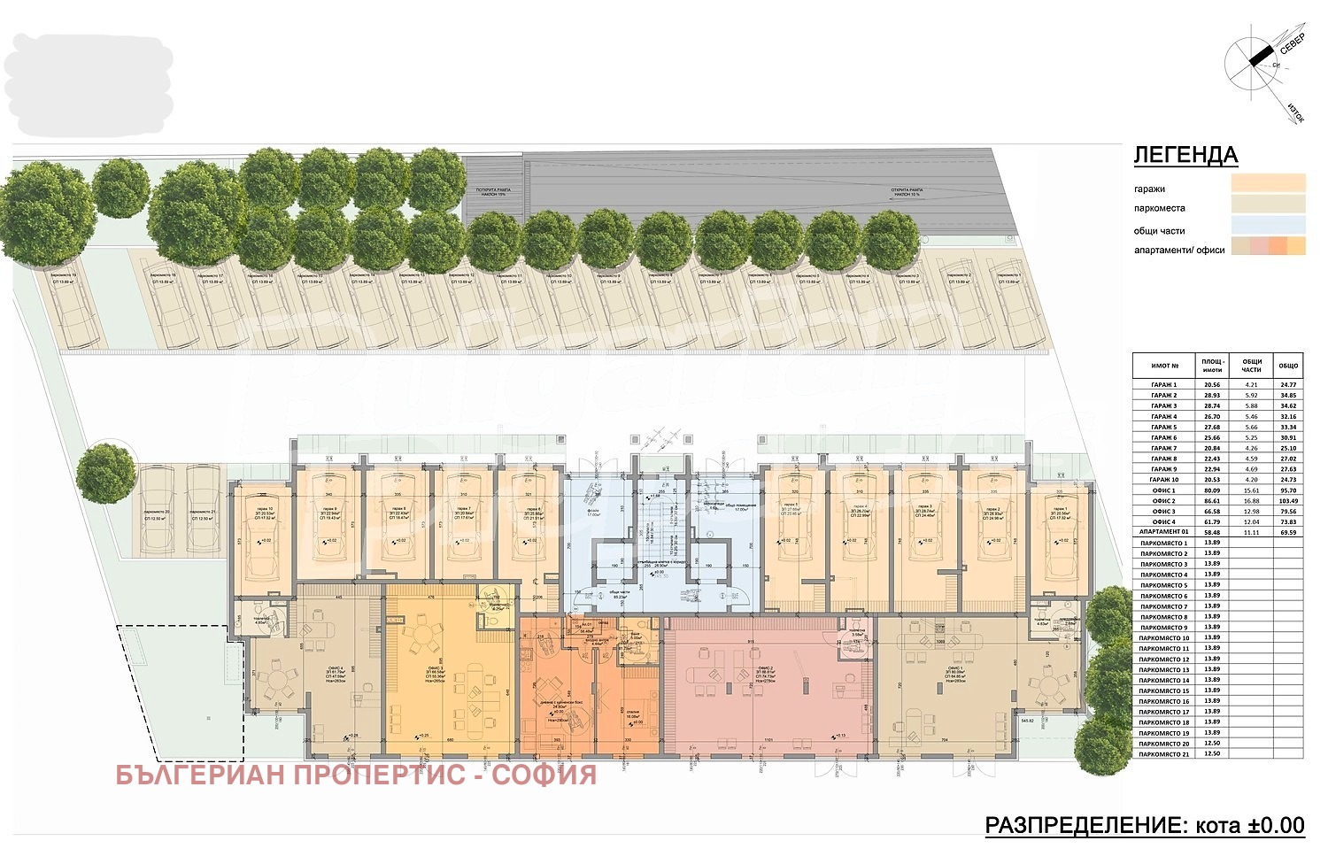За продажба се предлагат външни паркоместа с цена по 25 000 /48895.75 лв. без ДДС, както и складове 2 бр. по 10000 /19558.3 лв. без ДДС.