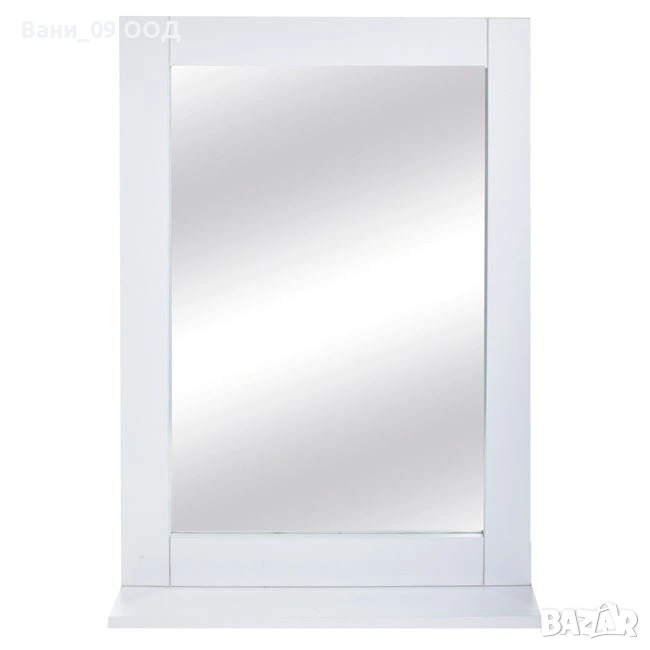 Огледало за баня с бяла дървена рамка и рафт-етажерка 50x11 cm. Това огледало е практично и декоративно допълнение към банята, дневната или спалнята. Отличава се с модерен стил, а етажерката може да побере козметика, продукти за грижа или декоративни елементи. Монтира се на стената с винтове и дюбели (включени).