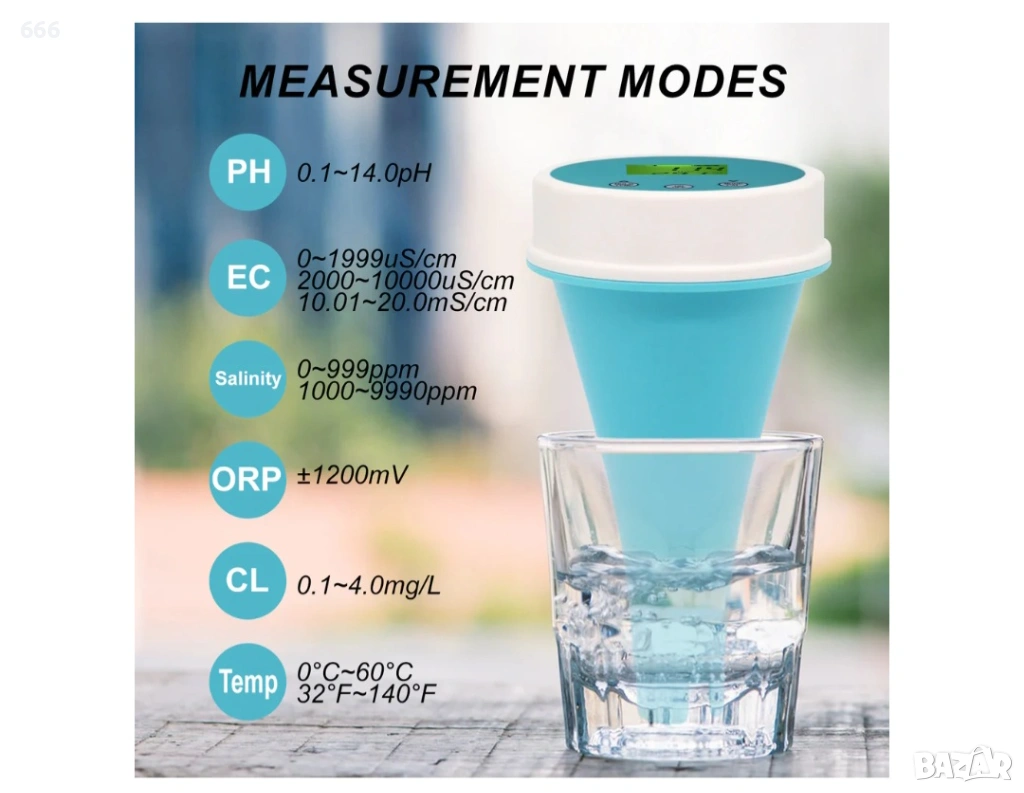 Температура: Мониторът включва и температурен сензор за точно измерване на температурата на водата.