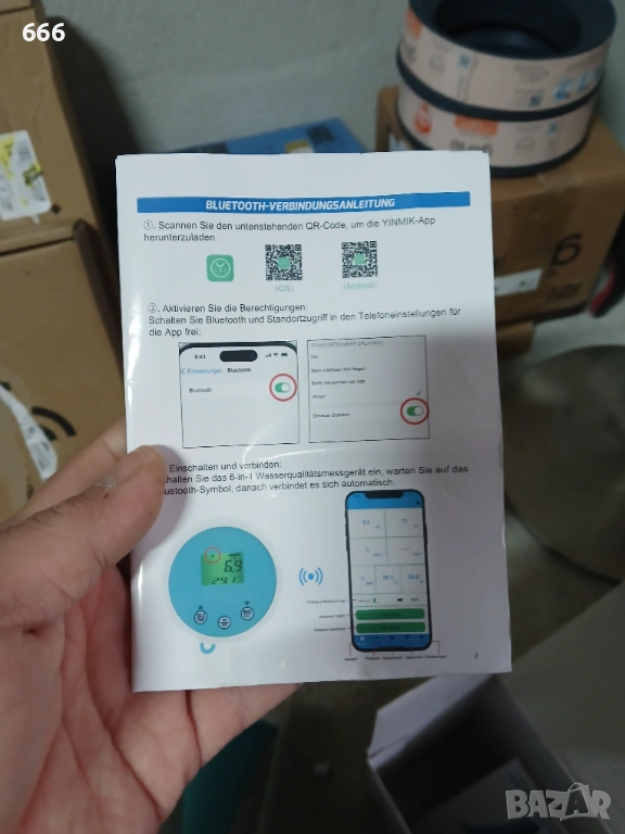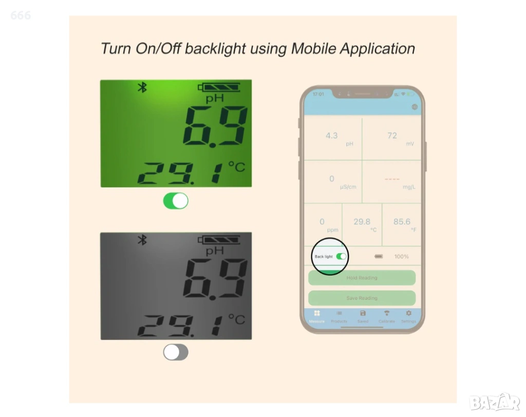 Bluetooth технология, която ви позволява да го свържете със смартфон или таблет за лесно прехвърляне на данни и наблюдение в реално време. Той също така разполага с функция за запис на данни до 1000 записа, което ви позволява да съхранявате и преглеждате измервания във времето за по-добро управление на качеството на водата.