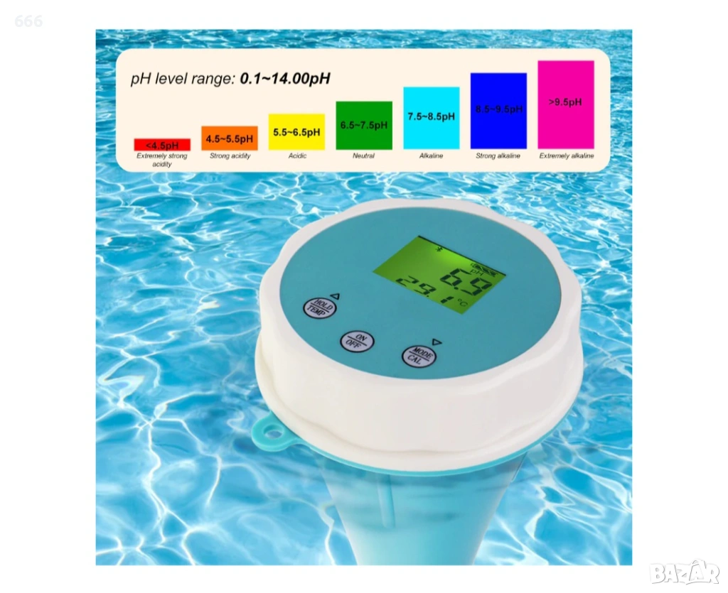 PH на водата: Нивото на pH показва киселинността или алкалността на водата, което е от решаващо значение за поддържането на комфортна и безопасна среда за плуване и къпане.