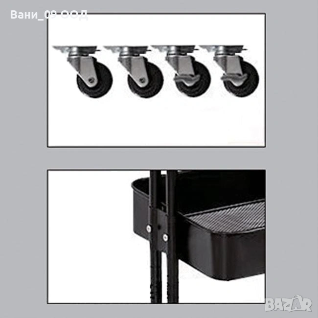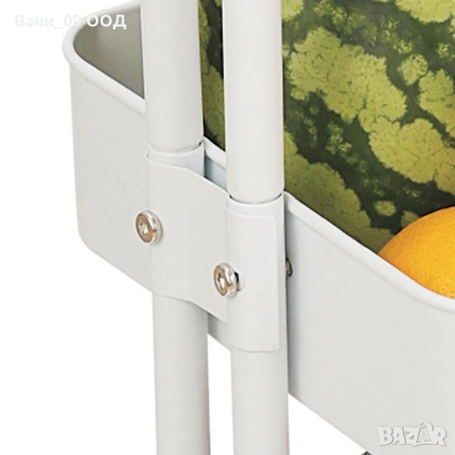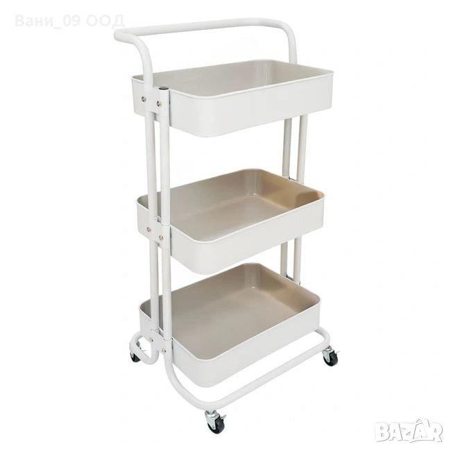 Метална сервизна количка с 3 етажерки и 4 колелца за лесно придвижване. Разполага с винтове от всяка страна за по-голяма устойчивост и сгъваема дръжка. Всеки рафт е с дълбочина 8 см. Подходяща е както за кухнята, така и за банята.