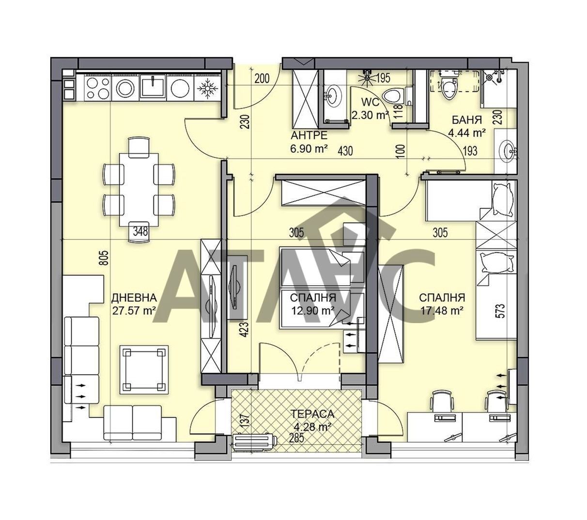 Апартаментът се състои от всекидневна с кухненски бокс и трапезария, две спални, баня с тоалетна, отделна тоалетна, тераса с излаз от трите стаи и входно антре.