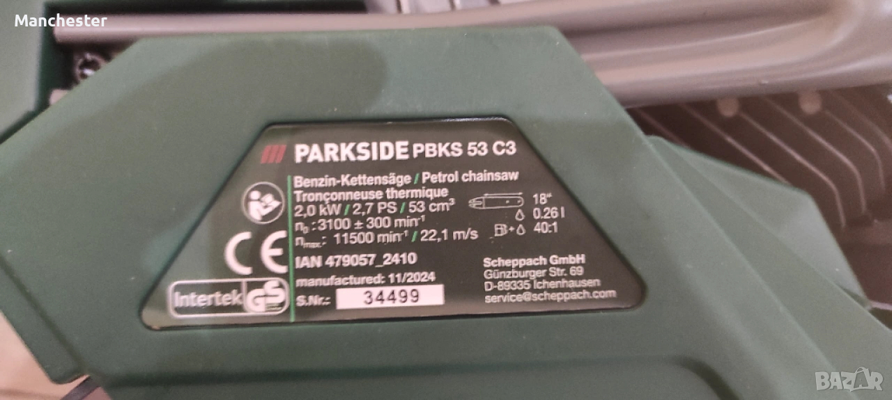 Бензинов верижен трион Parkside, модел PBKS 53 C3, 2 kW, дължина на рязане 45 см, система за автоматично смазване, 86x26x29см.