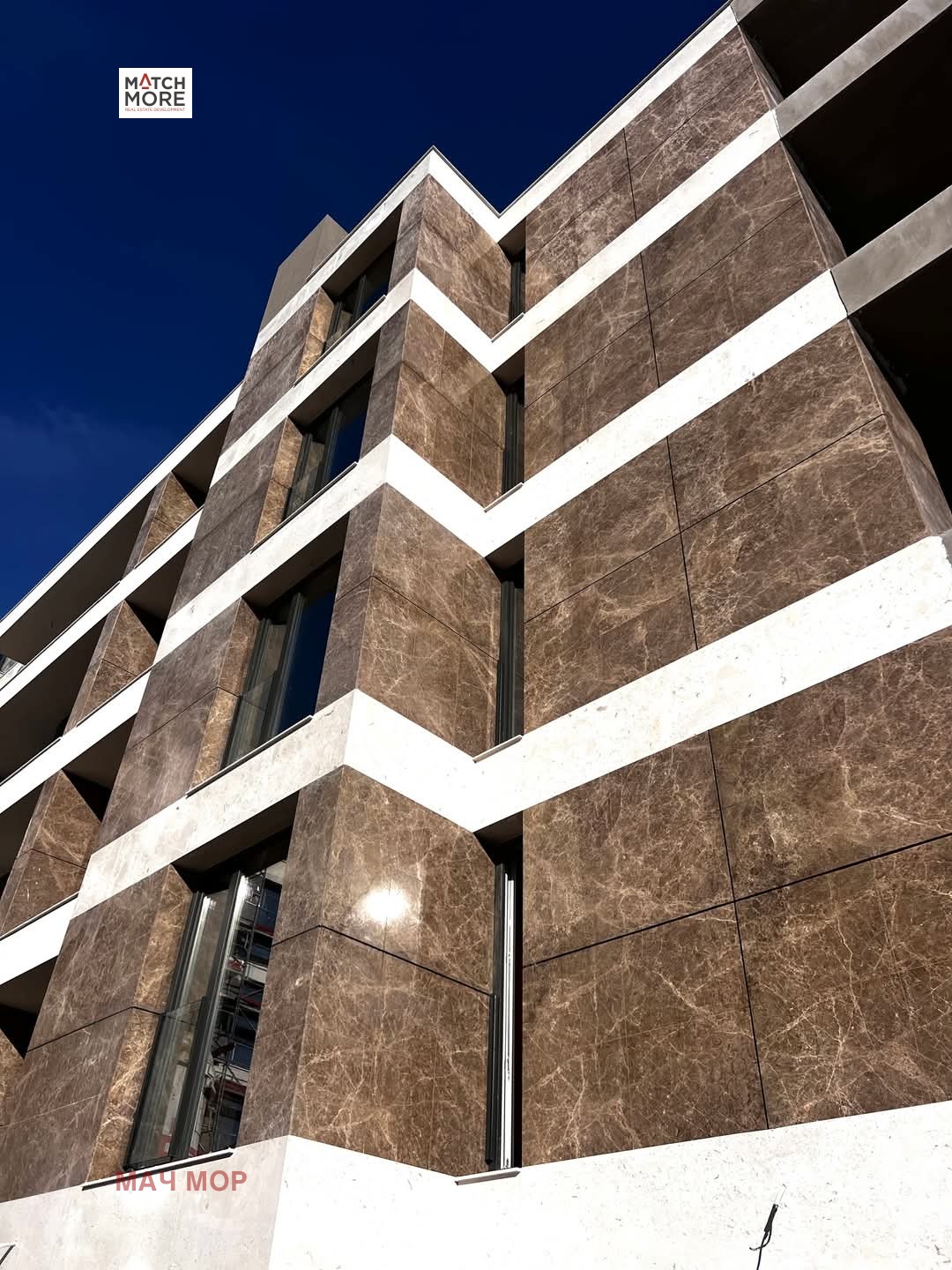 Фасадата на сградата е с изискана визия с композиция от мрамор и стъкло.