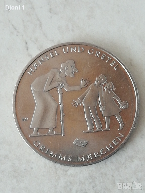 Възпоменателна монета от серия монети в чест на приказките на братя Грим, посветена на приказката „Хензел и Гретел“ Дизайнът, създаден от берлинската художничка Мариане Диц, изобразява ключова сцена от приказката, в която двете деца са изненадани от злата вещица в гората.