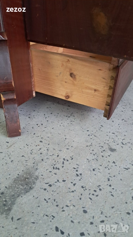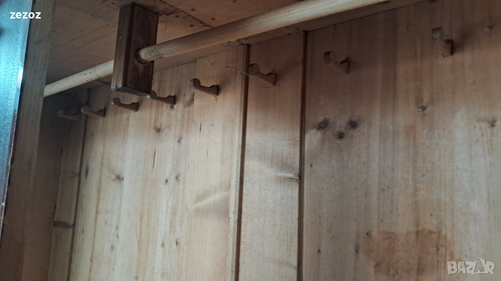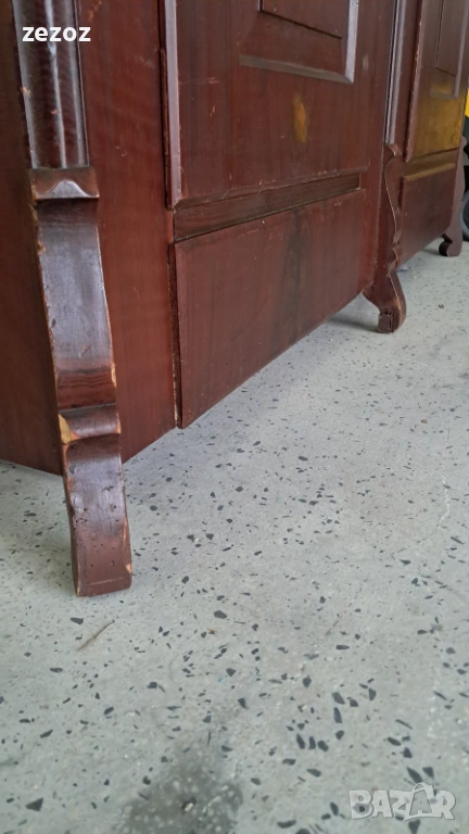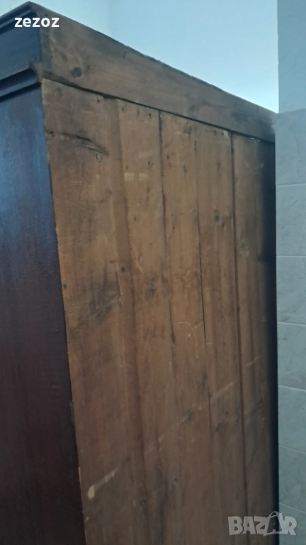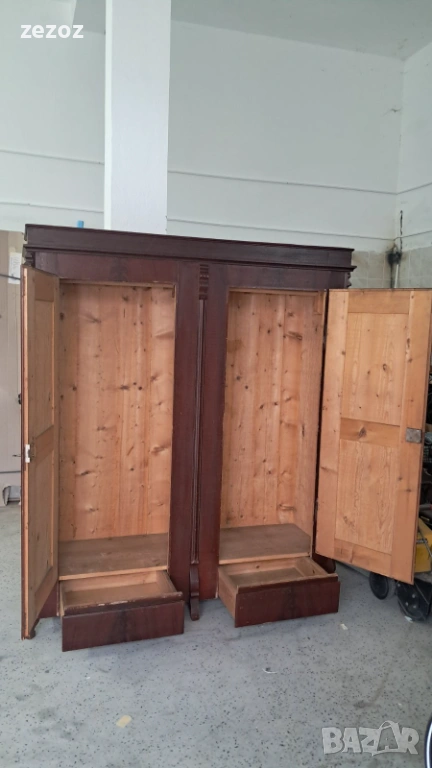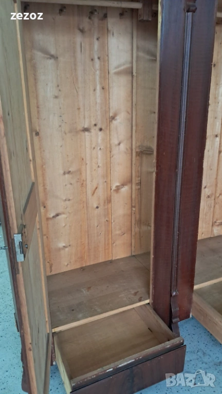 Антикварен двукрилен гардероб от началото на 20 век.Изработен изцяло от боров масив и външно оцветен.Тази методика е била много популярна след Първата Световна Война,период на липса на по-високо качество на материали,затова са използвали по-икономичен материал и са ги боядисвали с цветовете на дъб или махагон за да имат по-висока стойност.Този гардероб е типичен пример за това.За възраста си е много добре запазен с изразена патина по боята,ефекта "кракле",което му придава още чар.Оригиналните закачалки,прът за окачване,ключалки с оригиналния си костен обков.Две чекмеджета,които се отварят само при отворени врати на гардероба.Размери-