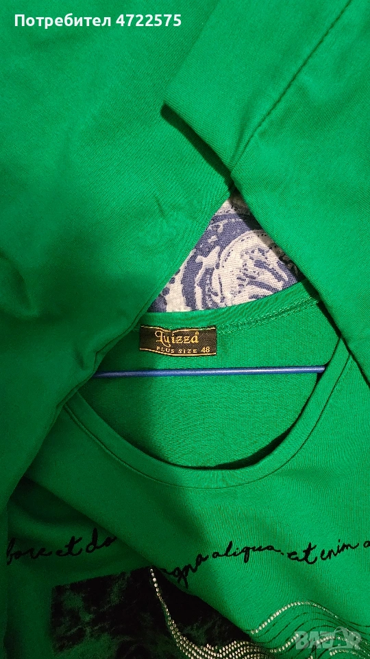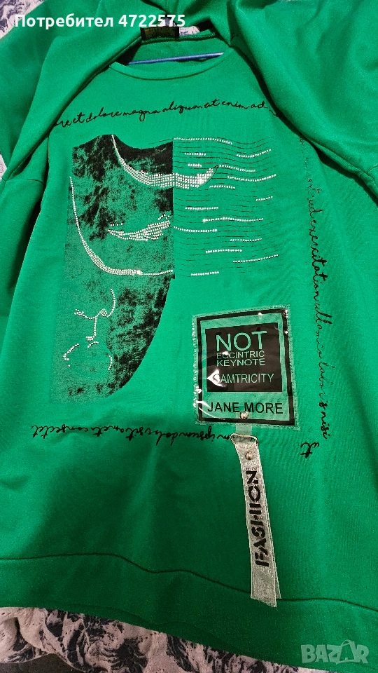 Зелен пуловер със свободна кройка, Турция. Красива, наситено зелена блуза с щампа и кристали. Свободна кройка, подходяща за размери 48-52.