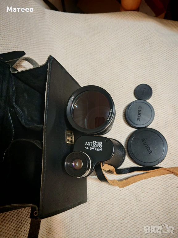 обектив 12х-1 бр. обектив Х 20 -1 бр, капачки на обективите и окуляра. Оптичните елементи са чисти, диоптричната корекция работи нормално.