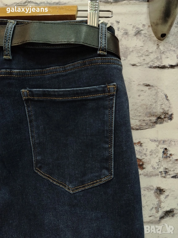 Модел Mom fit, Големи размери, Висока талия, С цип, По- широки в ханша, Тъмни, Леко избелени, Изчистени, Мек деним с еластан