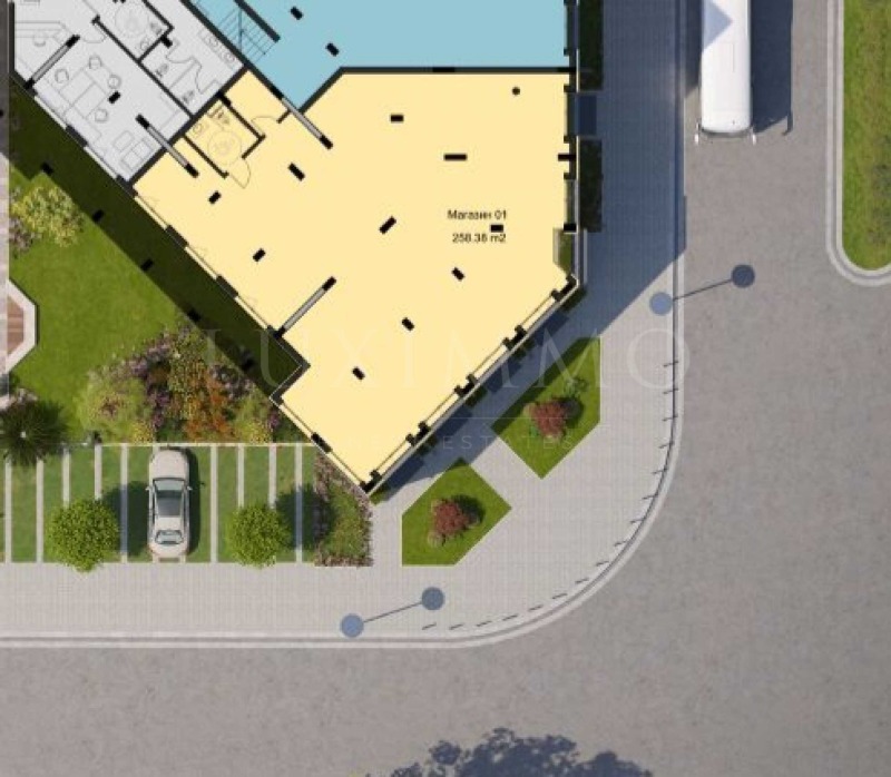 Имотът е с обща площ от 258,38 кв.м, разположен на партерен етаж с гледка към главна улица с голям човекопоток и басейна на комплекса. Състои се от едно основно, просторно помещение и санитарен възел. Има възможност да се отделят три отделни помещения.