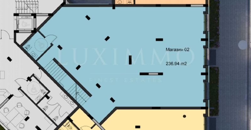 Имотът е с обща площ от 329,16 кв.м, разположен на две нива с гледка към главна улица с голям човекопоток. Състои се от едно основно, просторно помещение и санитарен възел на партерен етаж и едно помещение на 2-ри етаж. Има възможност да се отделят допълнителни помещения.