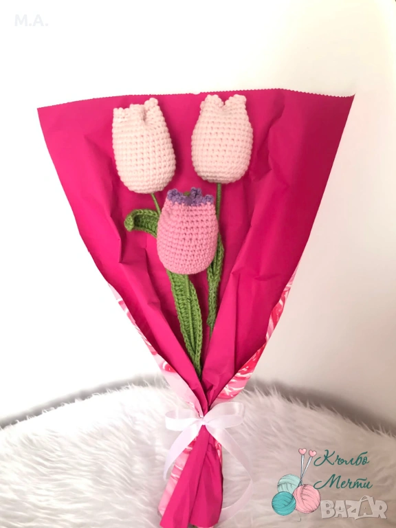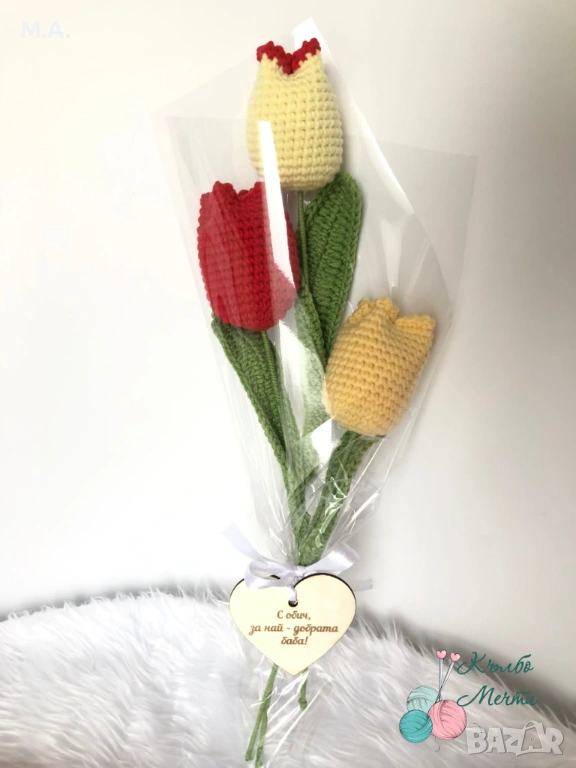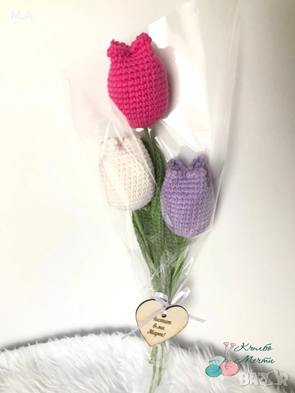 Цветята са ръчно изплетени на една кука.