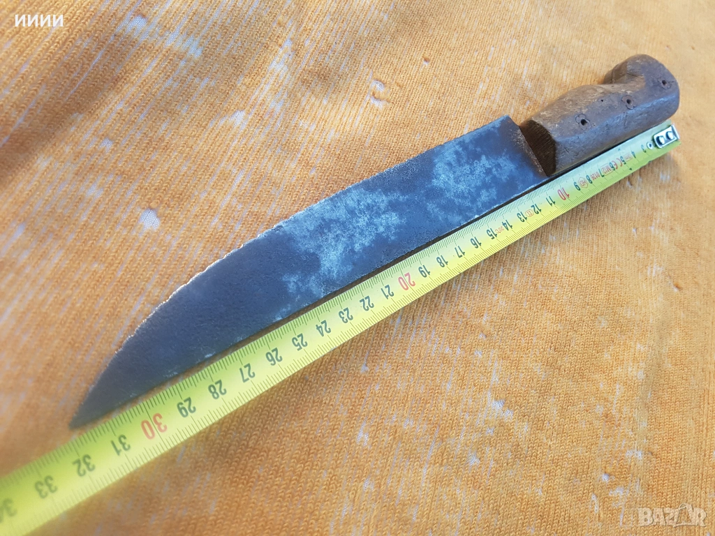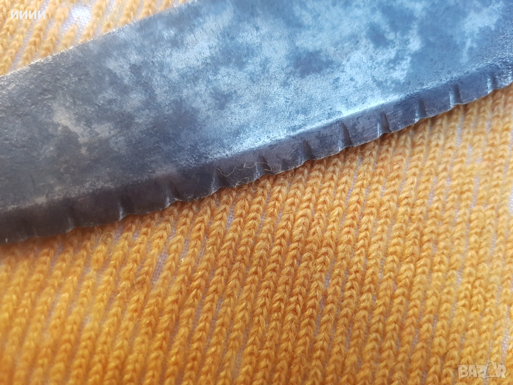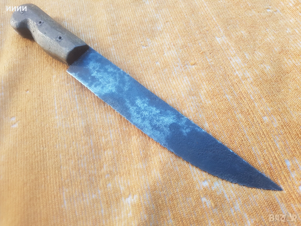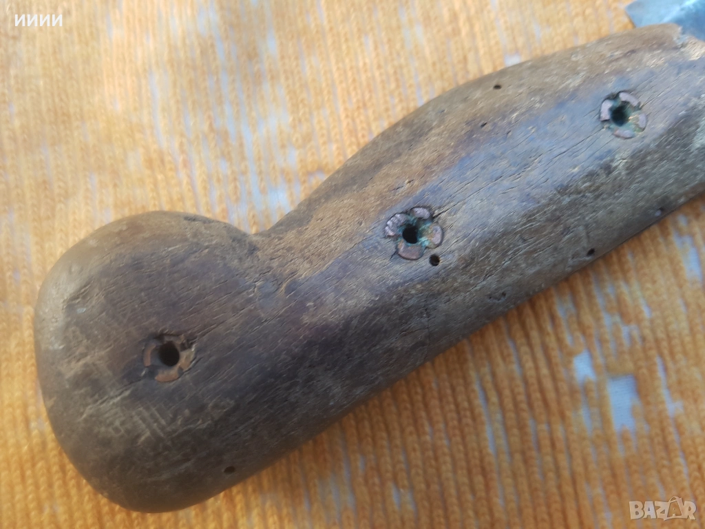 Изкован през втората половина на 19-ти век, острието му е с примитивен трион, по режещата си част. Дръжката, му е дървена с медни нитове, като цветчета и е без луфт.