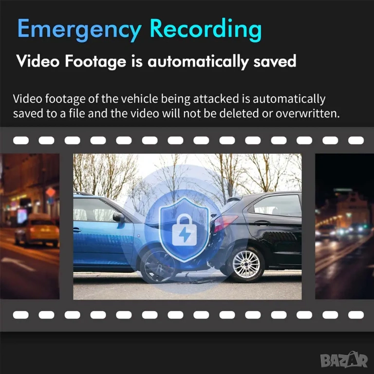 Ако превозното средство се сблъска, вграденият сензор за вибрации G автоматично заключва записаното видео, за да запише точно събитието.