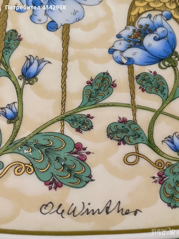 Чинията е декорирана с изящна композиция от нежни сини цветя под златисти орнаментални елементи, с фини детайли и пастелна цветова гама. Характерен поетичен и декоративен стил, типичен за творчеството на Ole Winther.