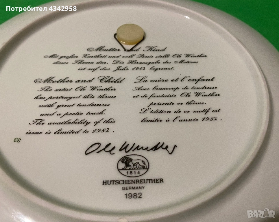 Изискана колекционерска стенна чиния, произведена от престижната немска фабрика Hutschenreuther, с художествен дизайн на Ole Winther.