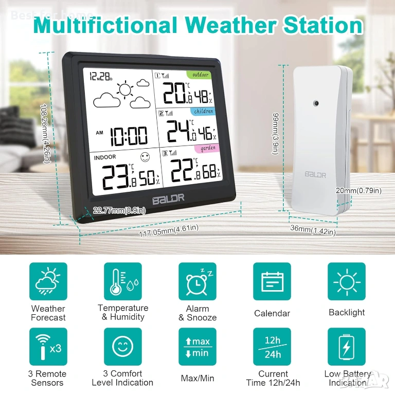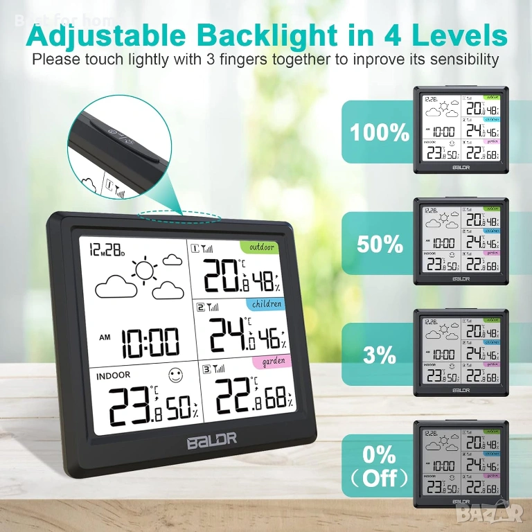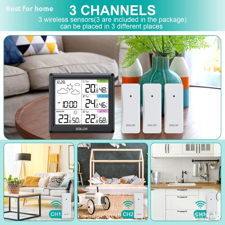 3 Външни сензора в комплекта:Позволяват едновременно следене на климатичните условия в различни стаи или на открито.
